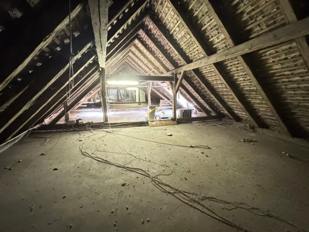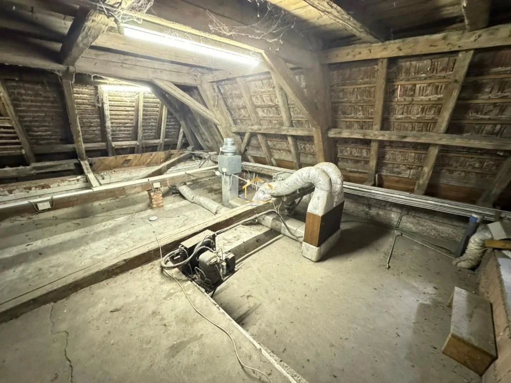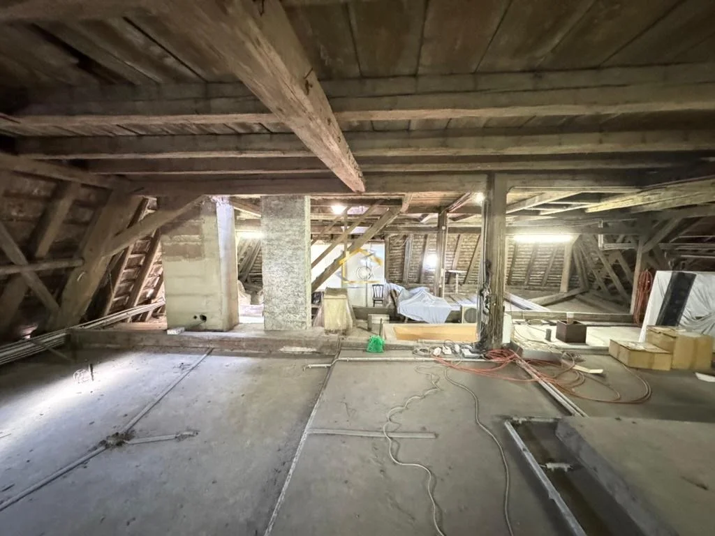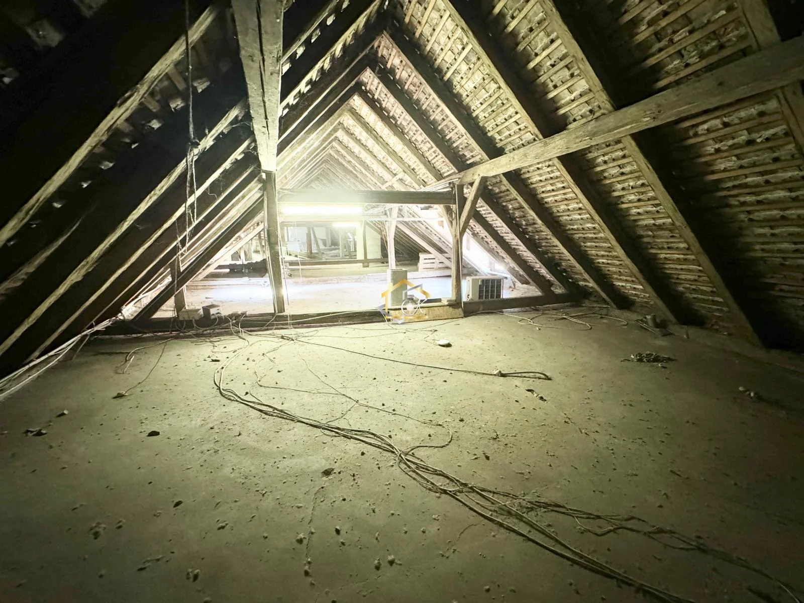 Das Dachgeschoss, mit einer Deckenhöhe von über drei Metern und einer Fläche von über 400 Quadratmetern, bietet enormes Potenzial und kann vollständig zu zusätzlichem Wohnraum umgestaltet werden.
