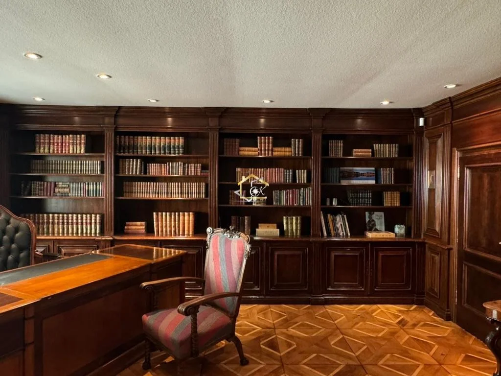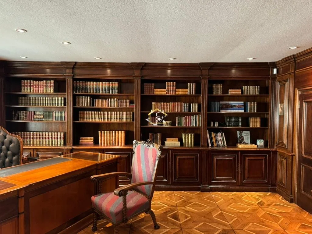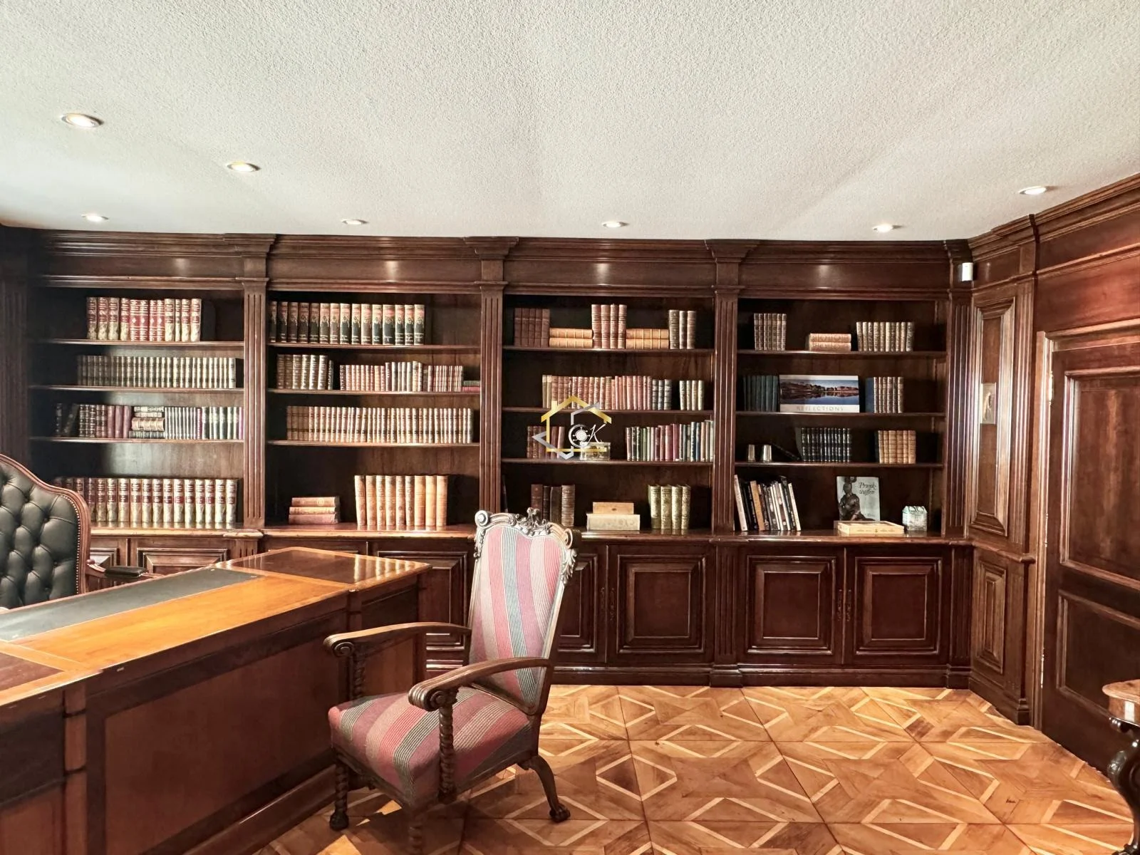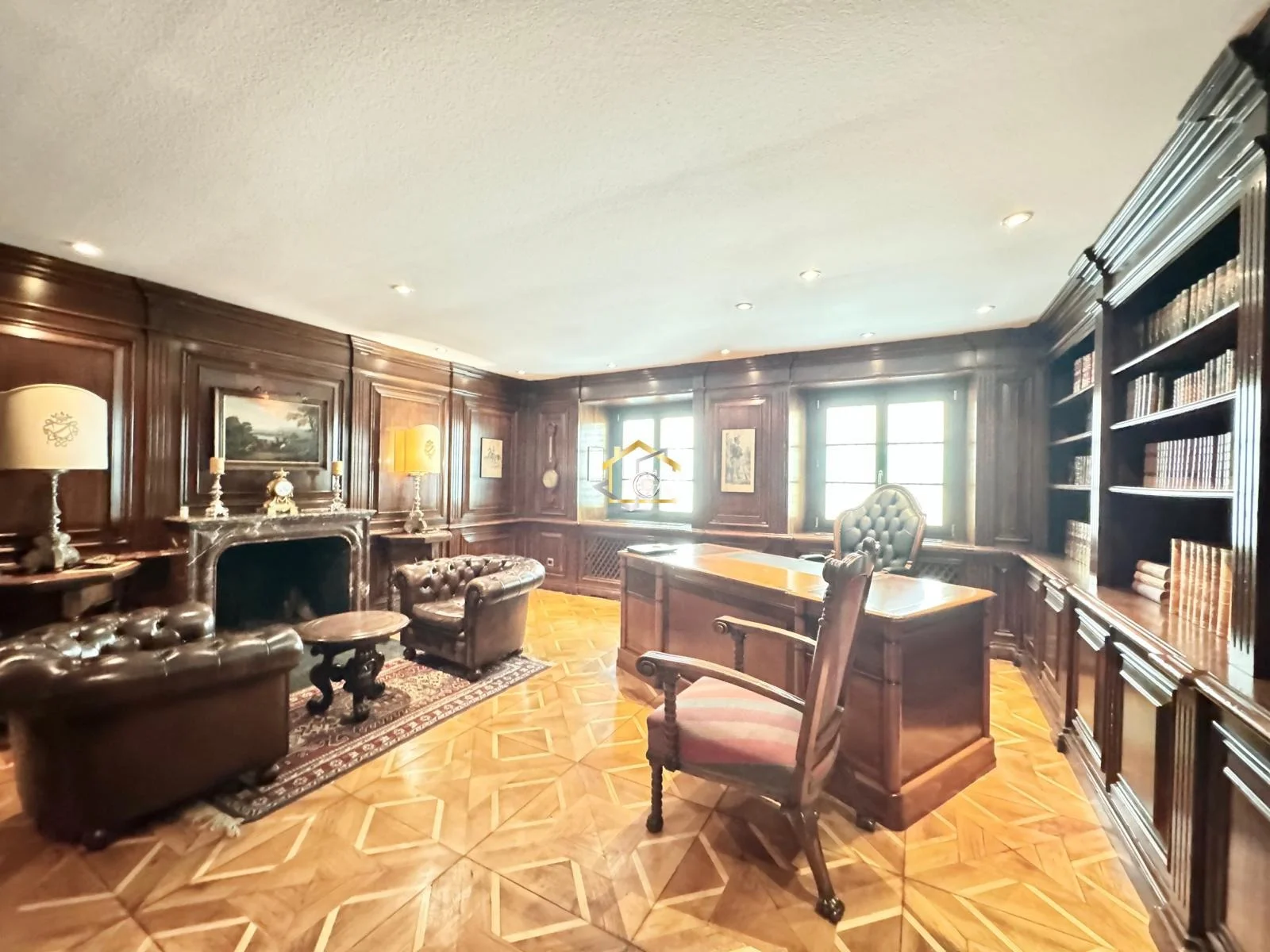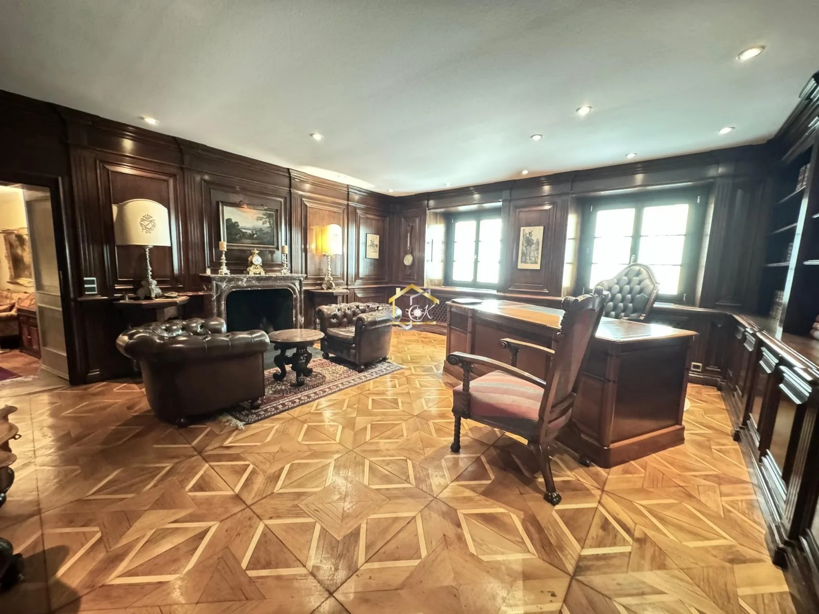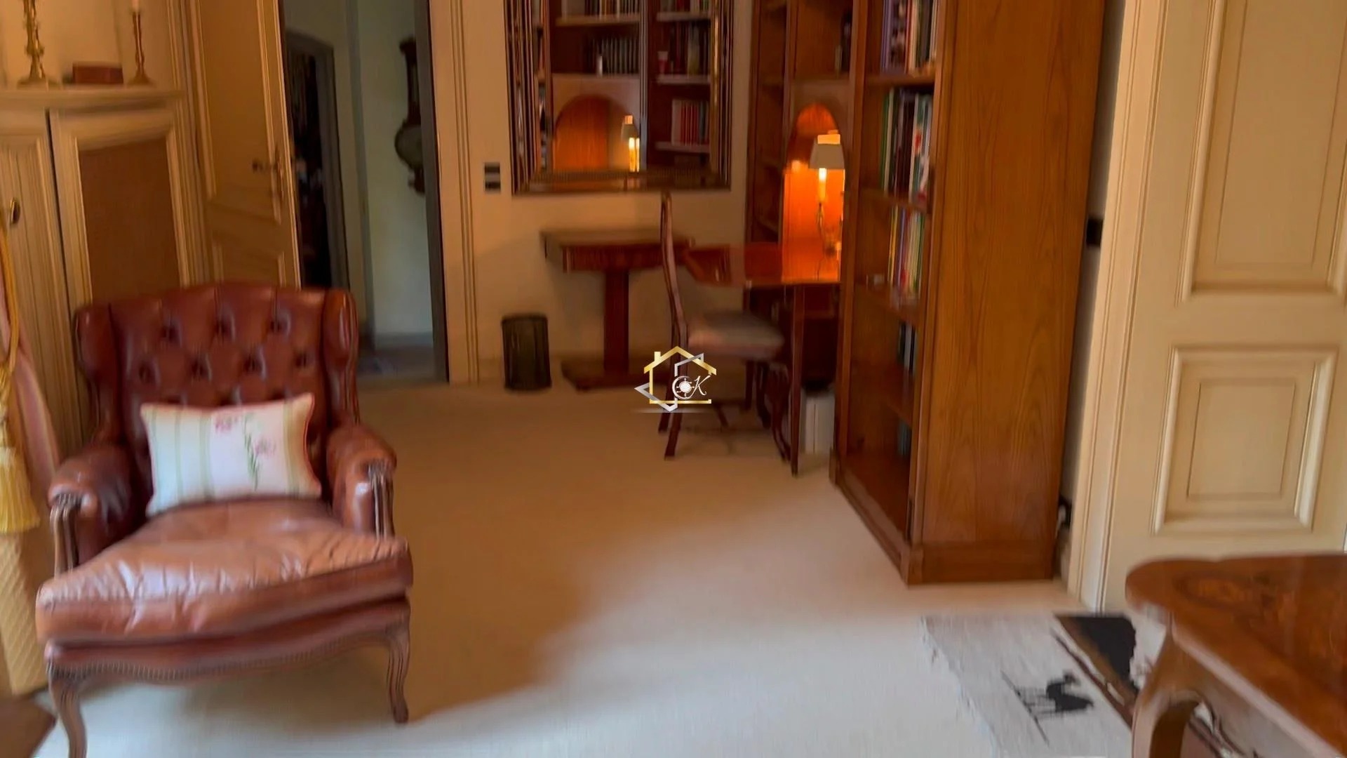 Das Obergeschoss bietet eine Küche und ein Esszimmer mit Zugang zu einer großen Terrasse, ein Kaminzimmer, ein Büro, fünf Schlafzimmer und fünf Bäder. Ein charmantes Studio-Apartment mit eigenem Eingang erweitert das Raumangebot.