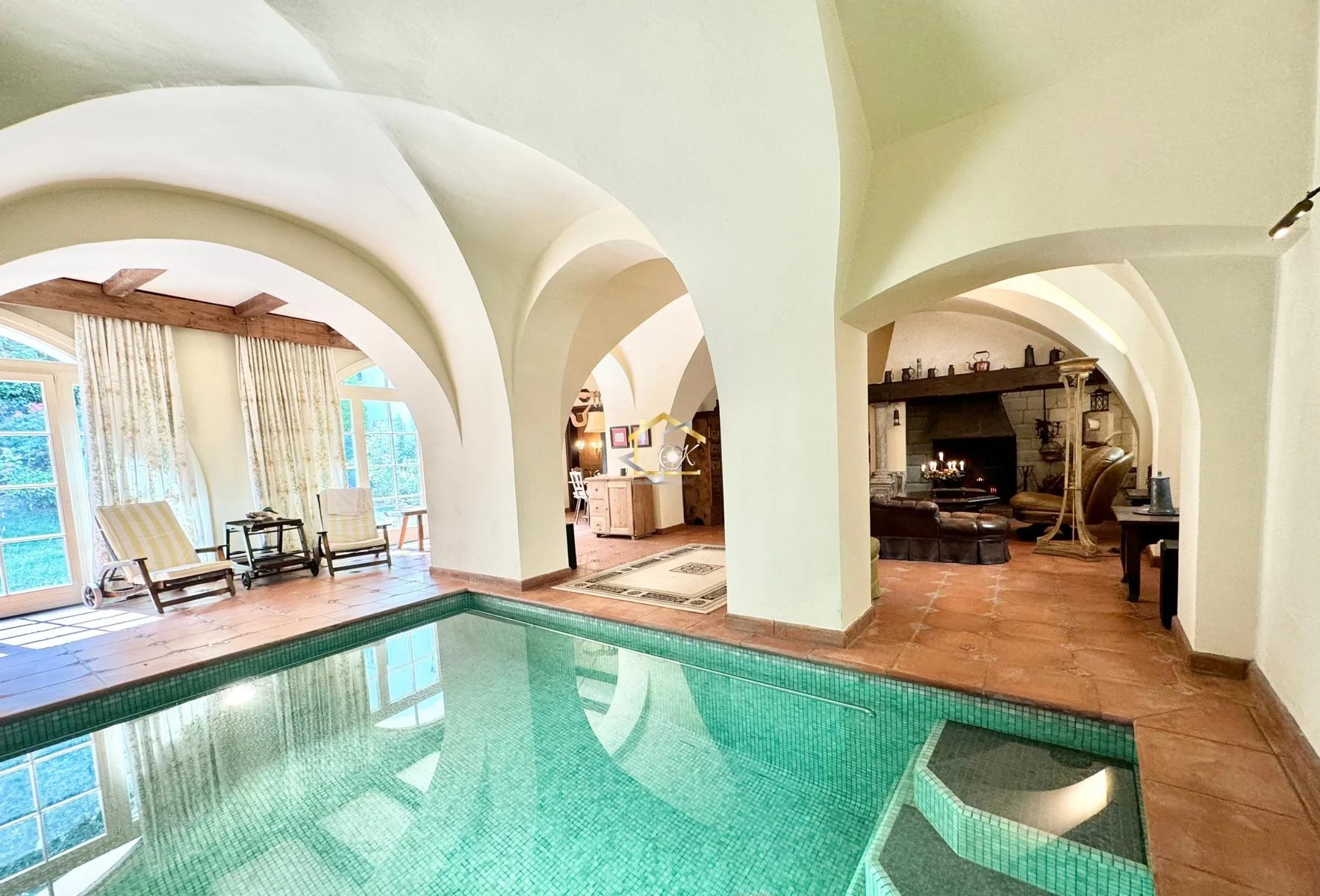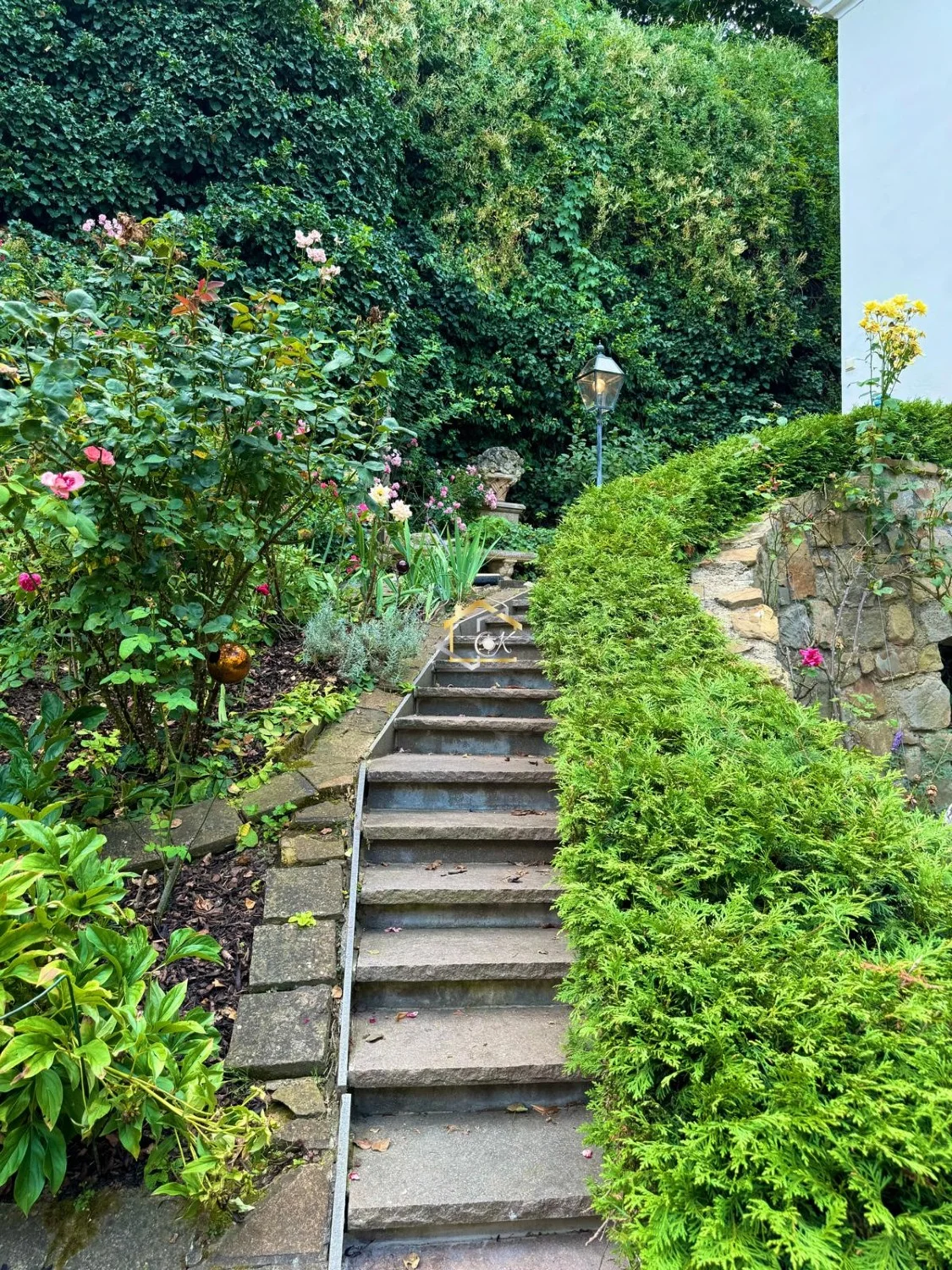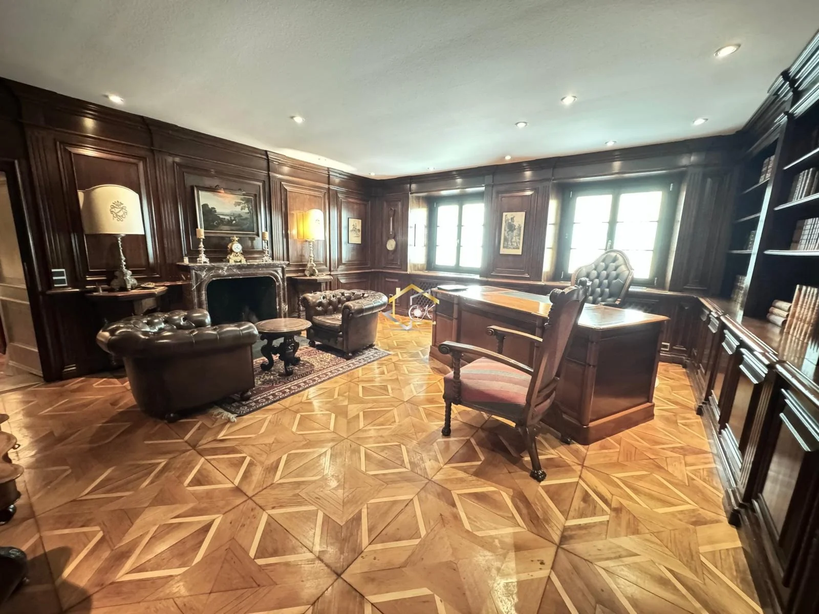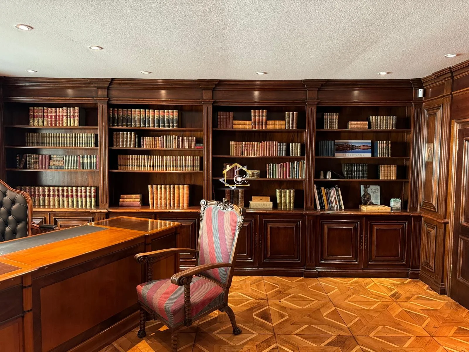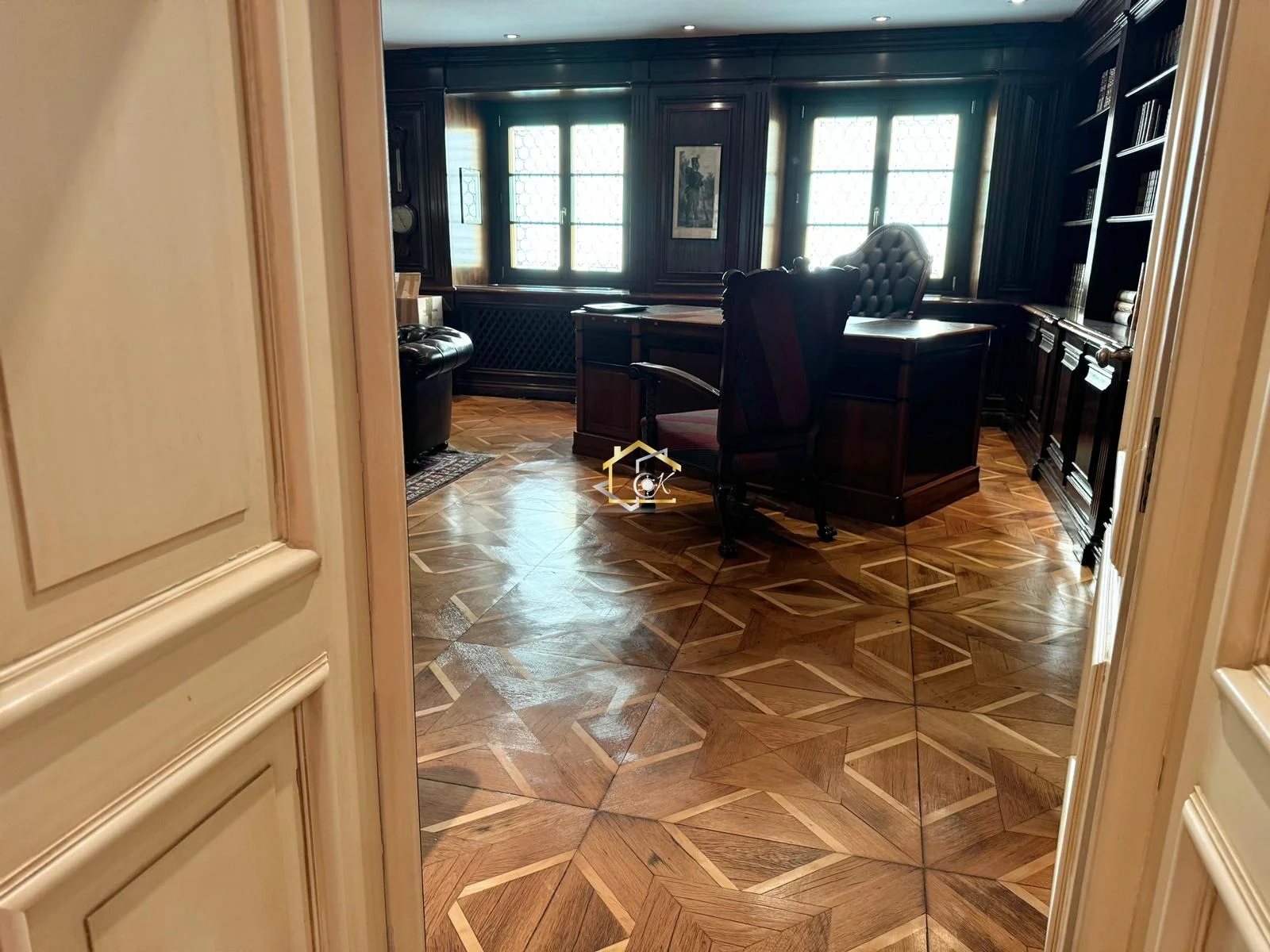 Das Obergeschoss bietet eine Küche und ein Esszimmer mit Zugang zu einer großen Terrasse, ein Kaminzimmer, ein Büro, fünf Schlafzimmer und fünf Bäder. Ein charmantes Studio-Apartment mit eigenem Eingang erweitert das Raumangebot.