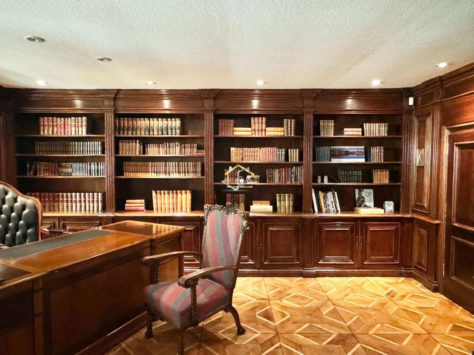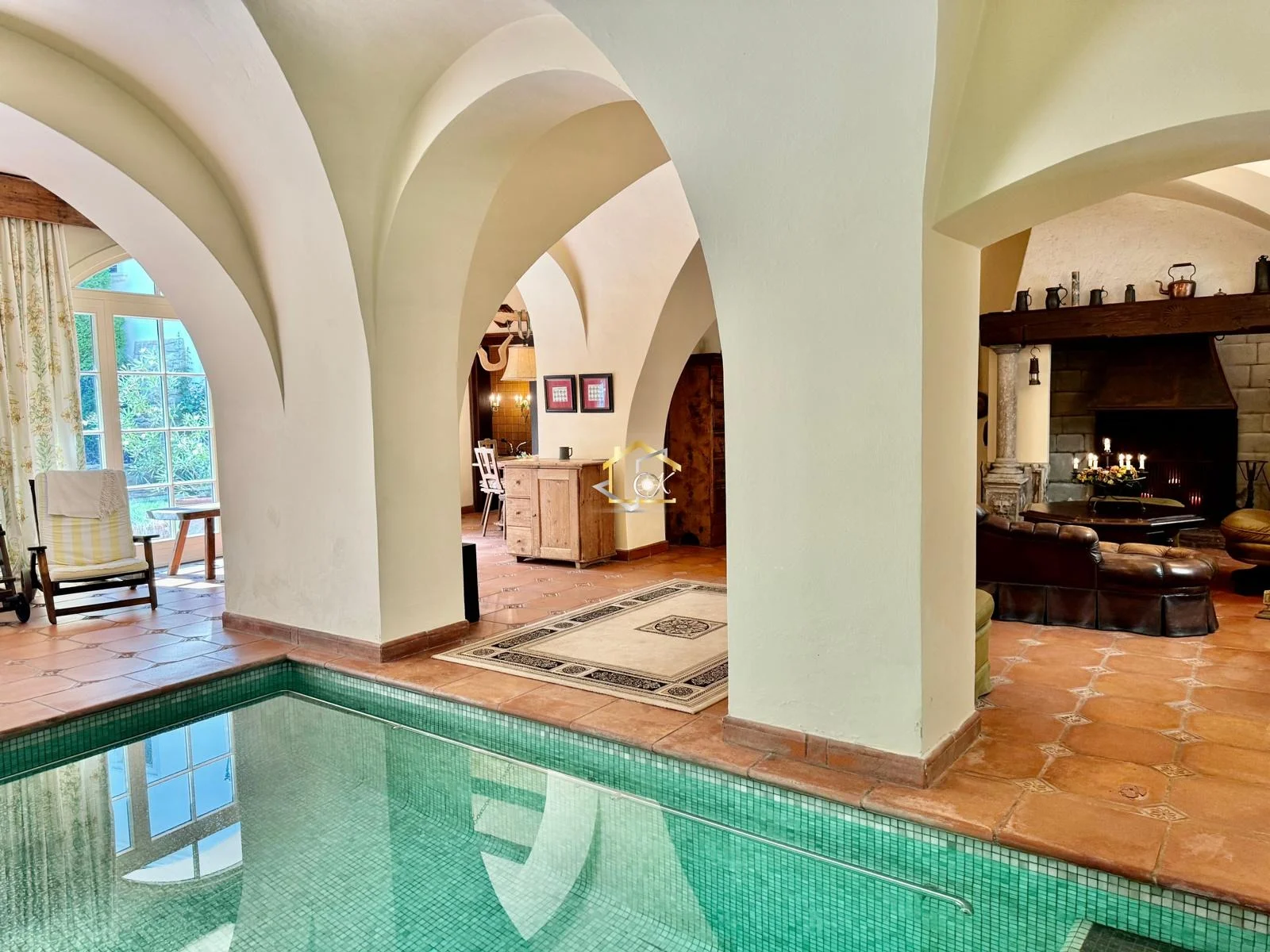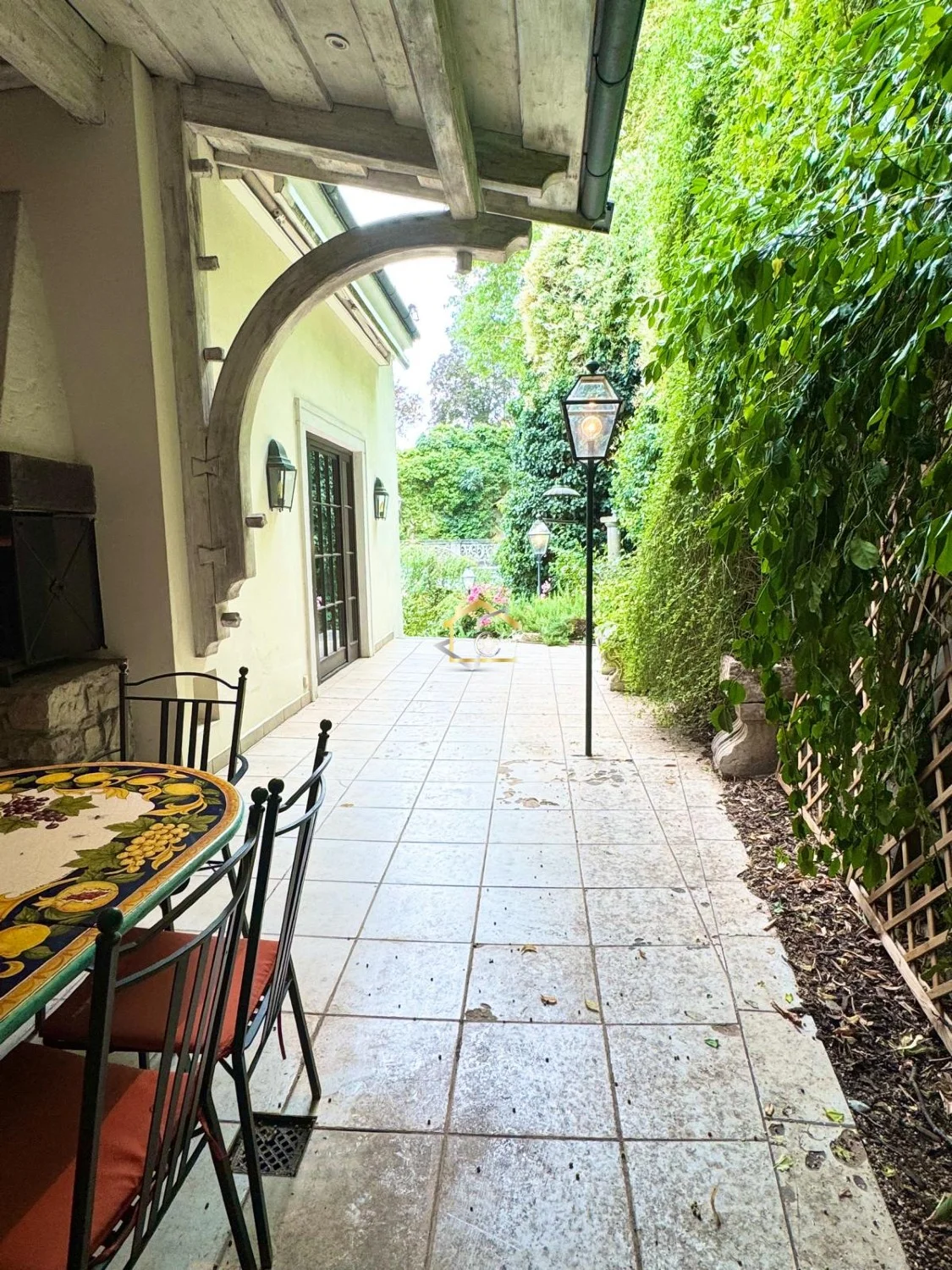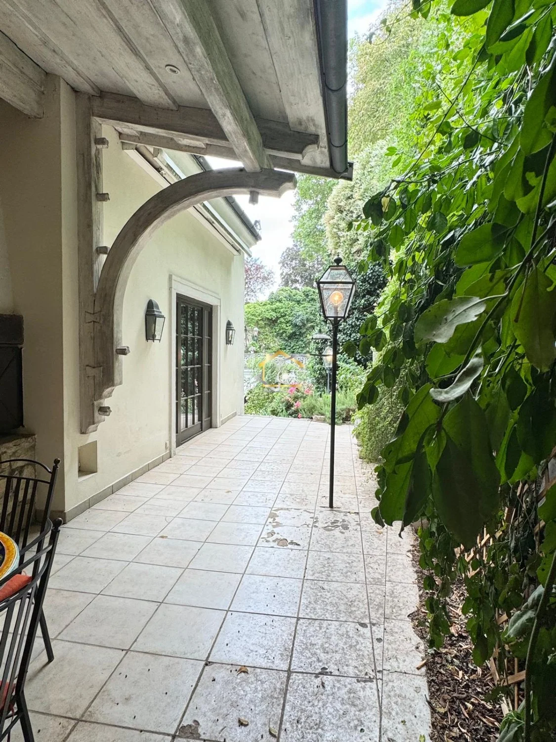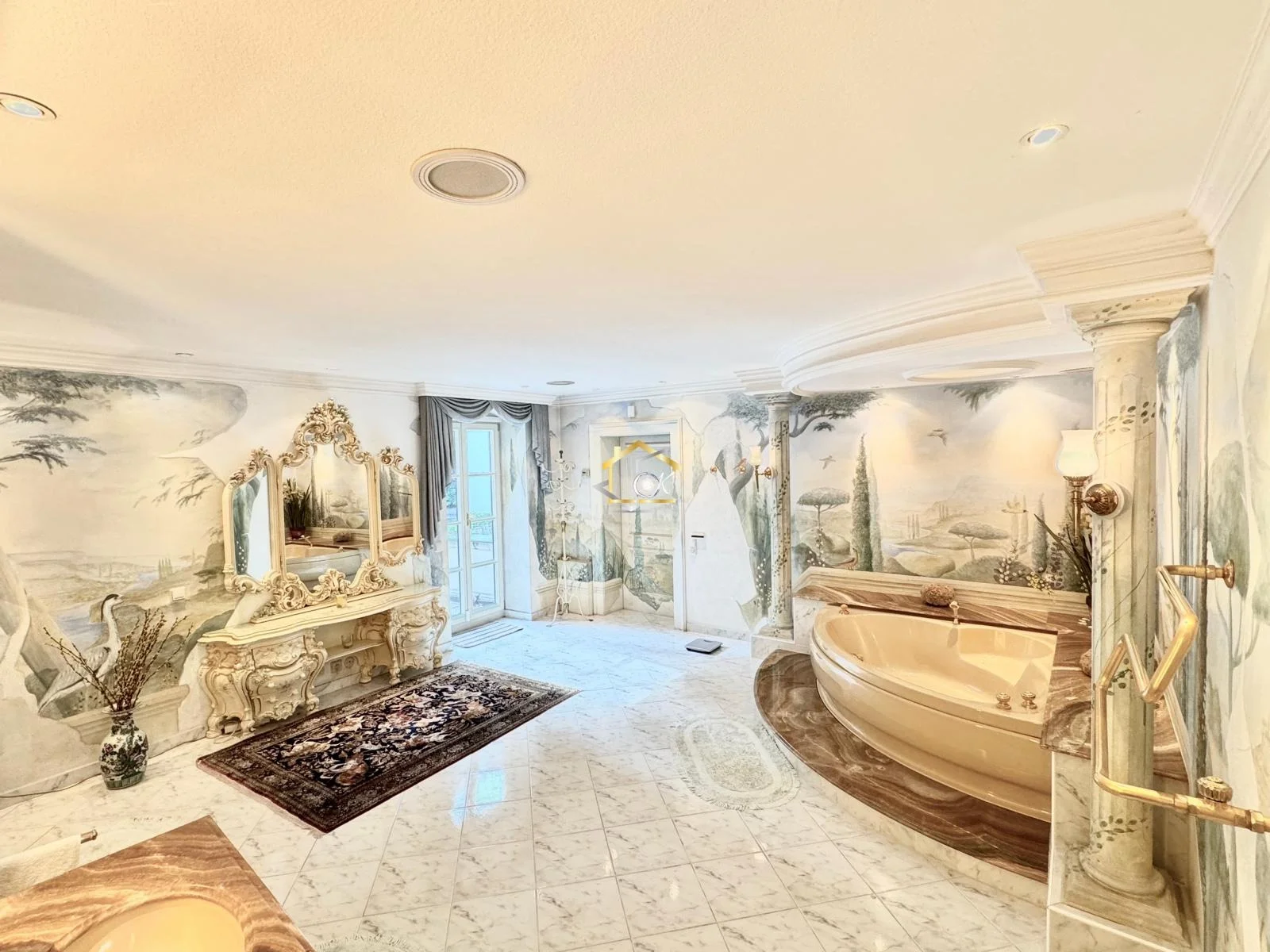 Das Obergeschoss bietet eine Küche und ein Esszimmer mit Zugang zu einer großen Terrasse, ein Kaminzimmer, ein Büro, fünf Schlafzimmer und fünf Bäder. Ein charmantes Studio-Apartment mit eigenem Eingang erweitert das Raumangebot.