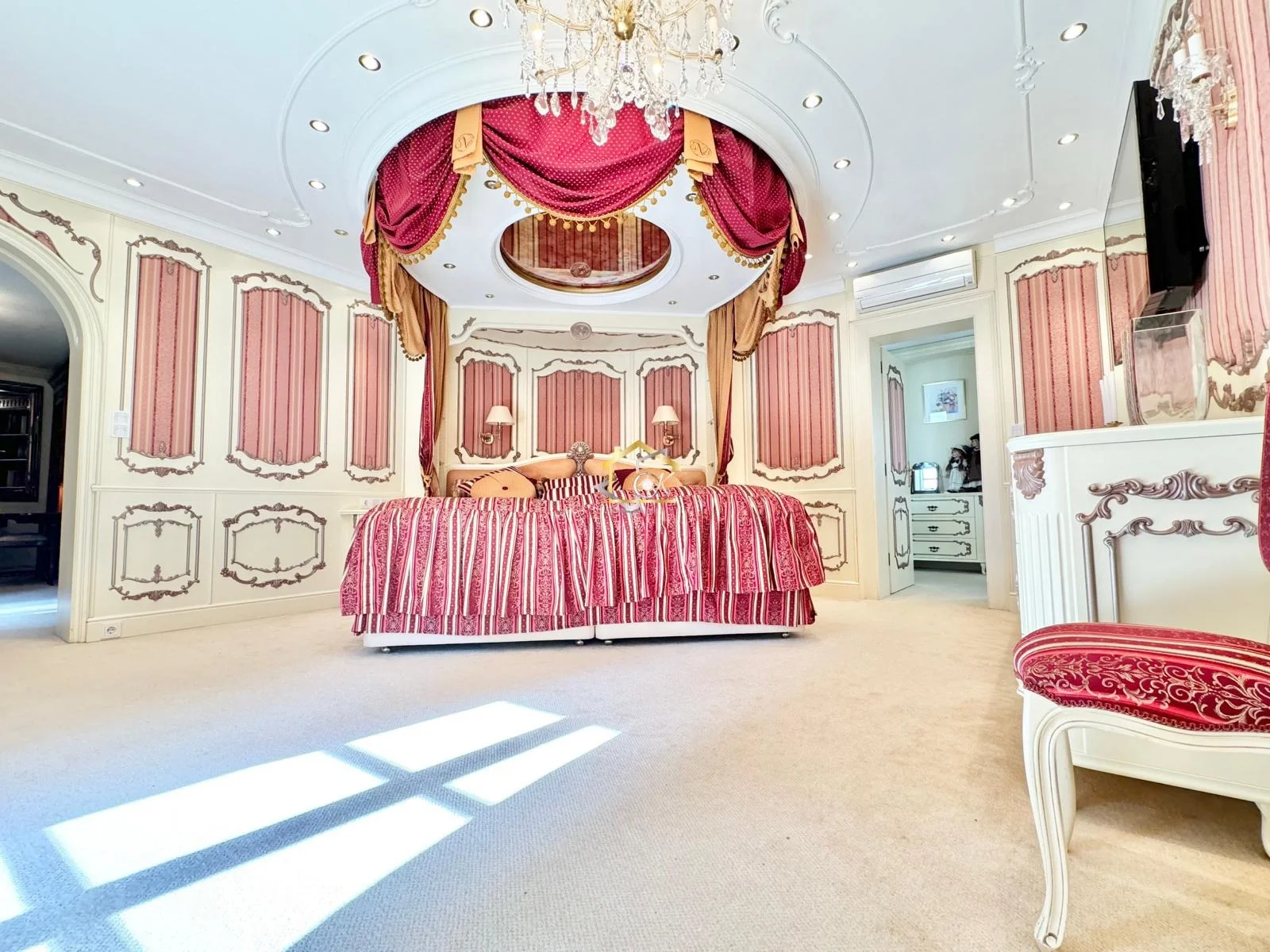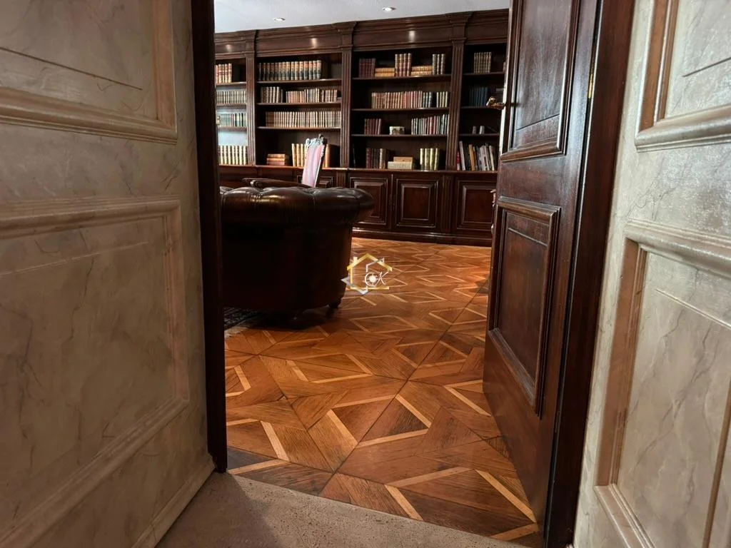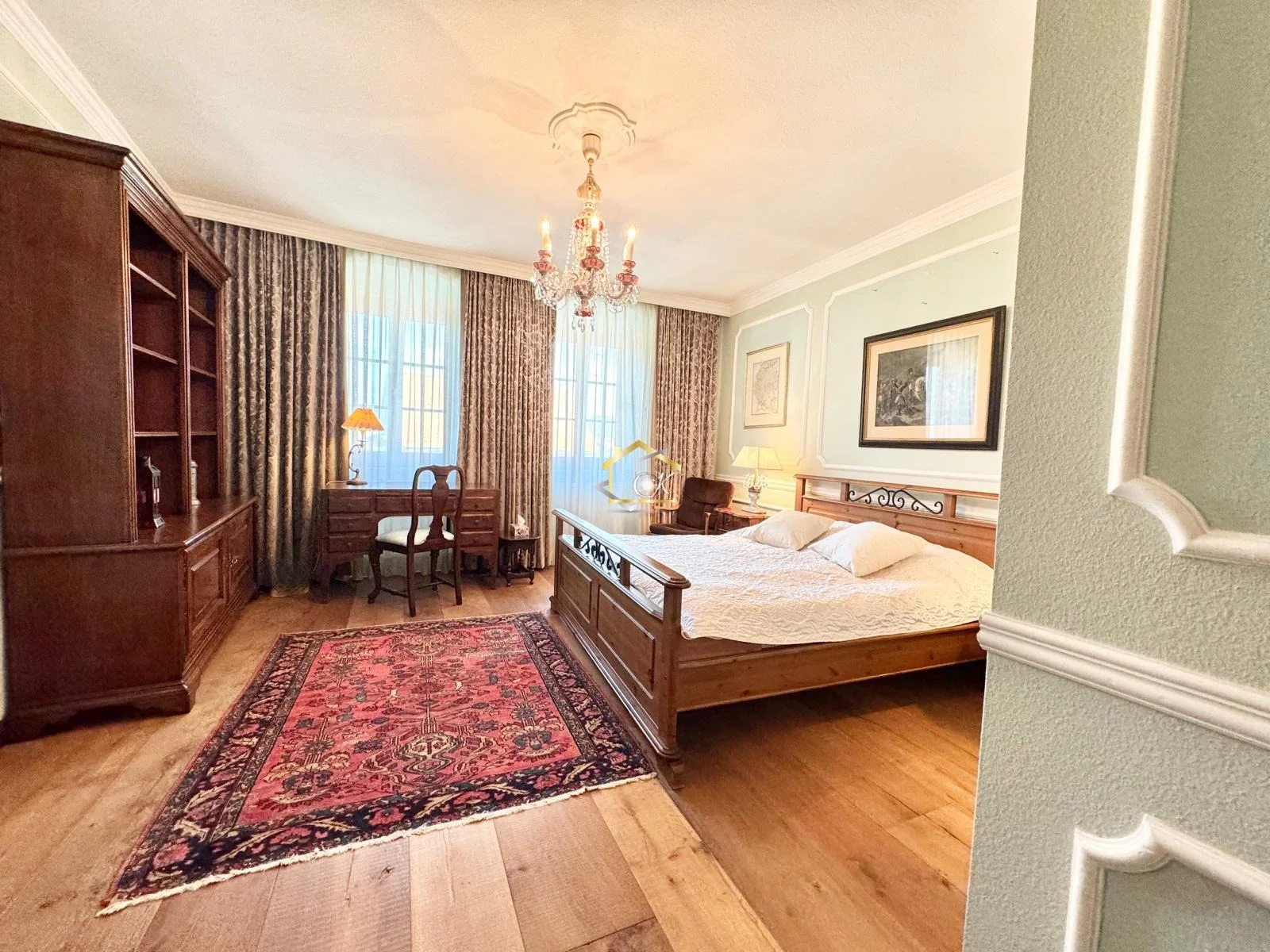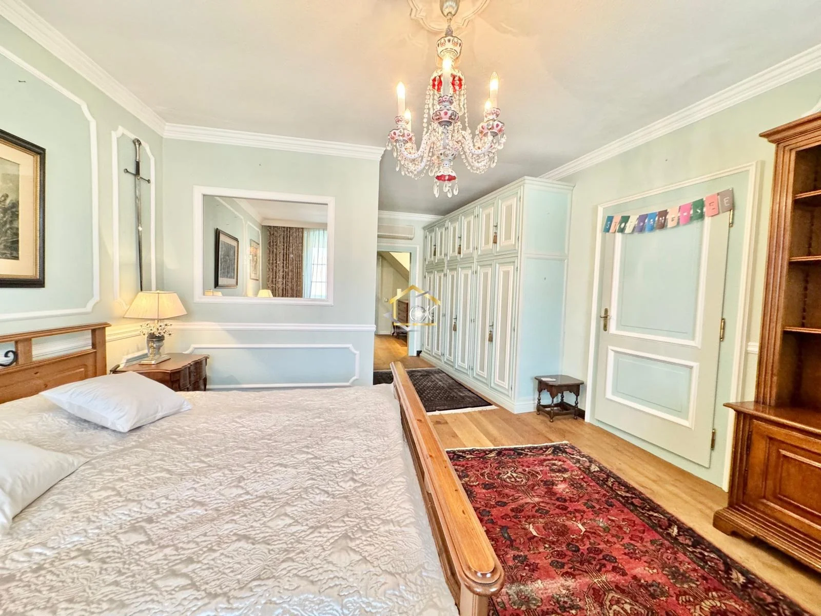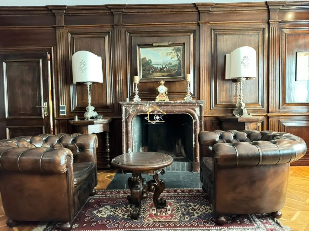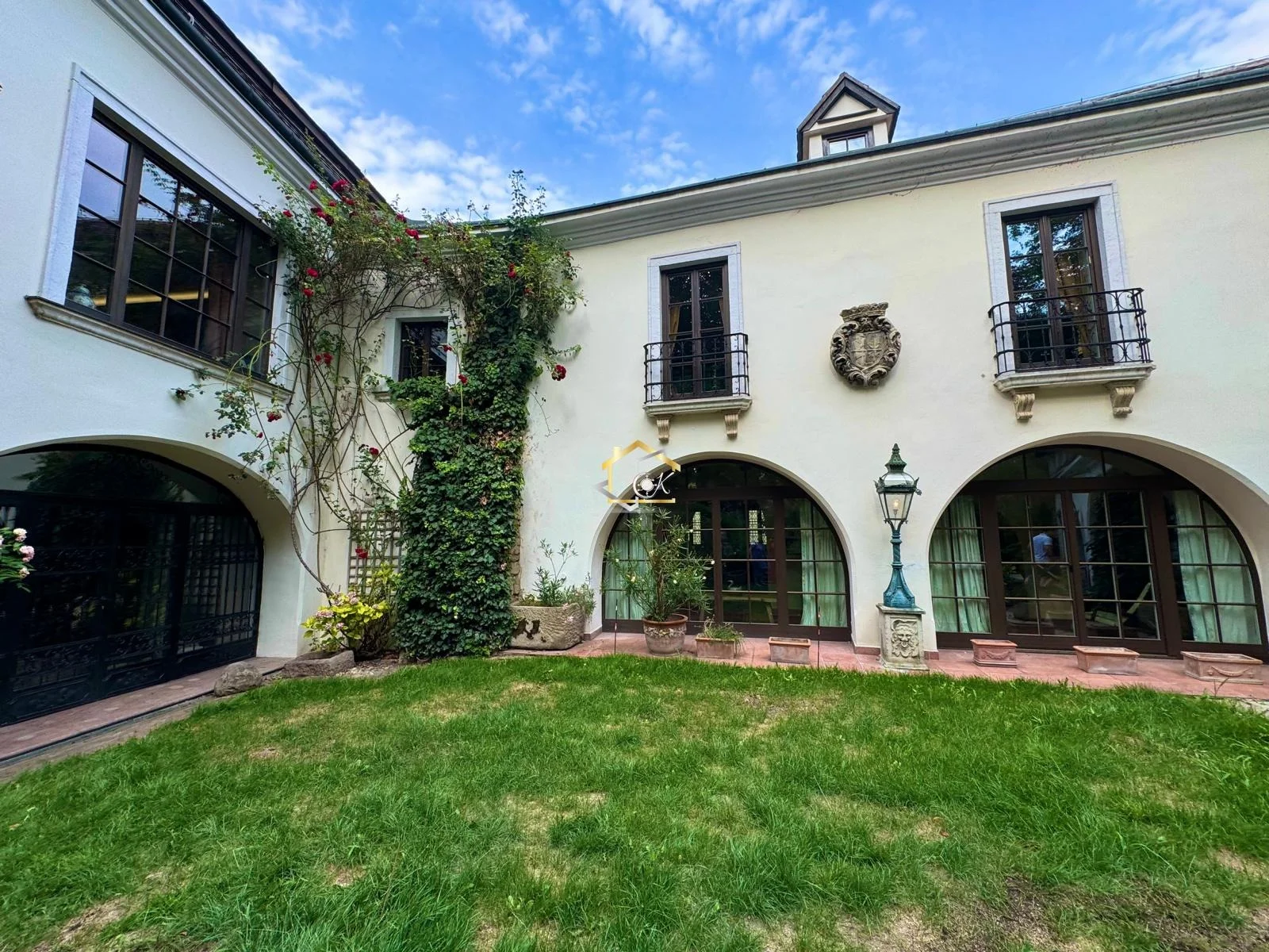 Das Obergeschoss bietet eine Küche und ein Esszimmer mit Zugang zu einer großen Terrasse, ein Kaminzimmer, ein Büro, fünf Schlafzimmer und fünf Bäder. Ein charmantes Studio-Apartment mit eigenem Eingang erweitert das Raumangebot.