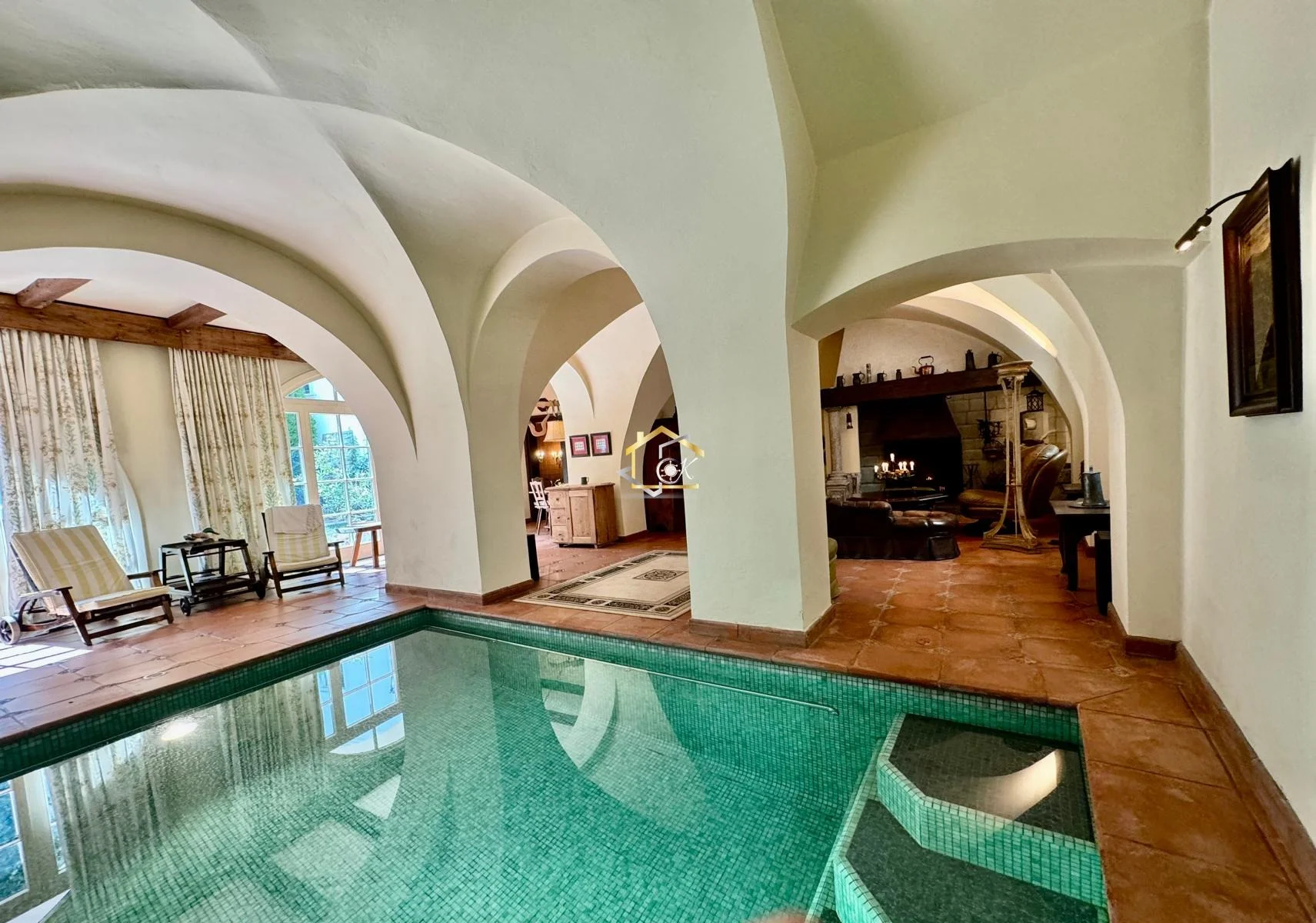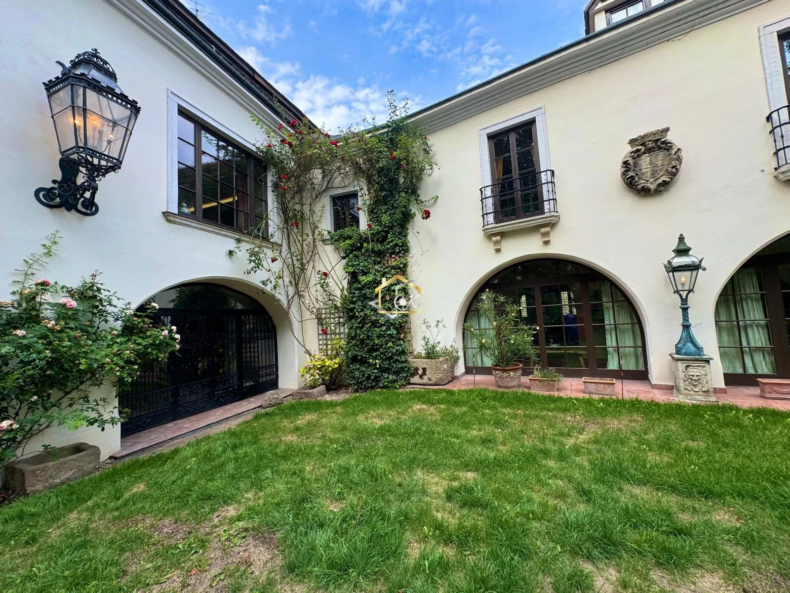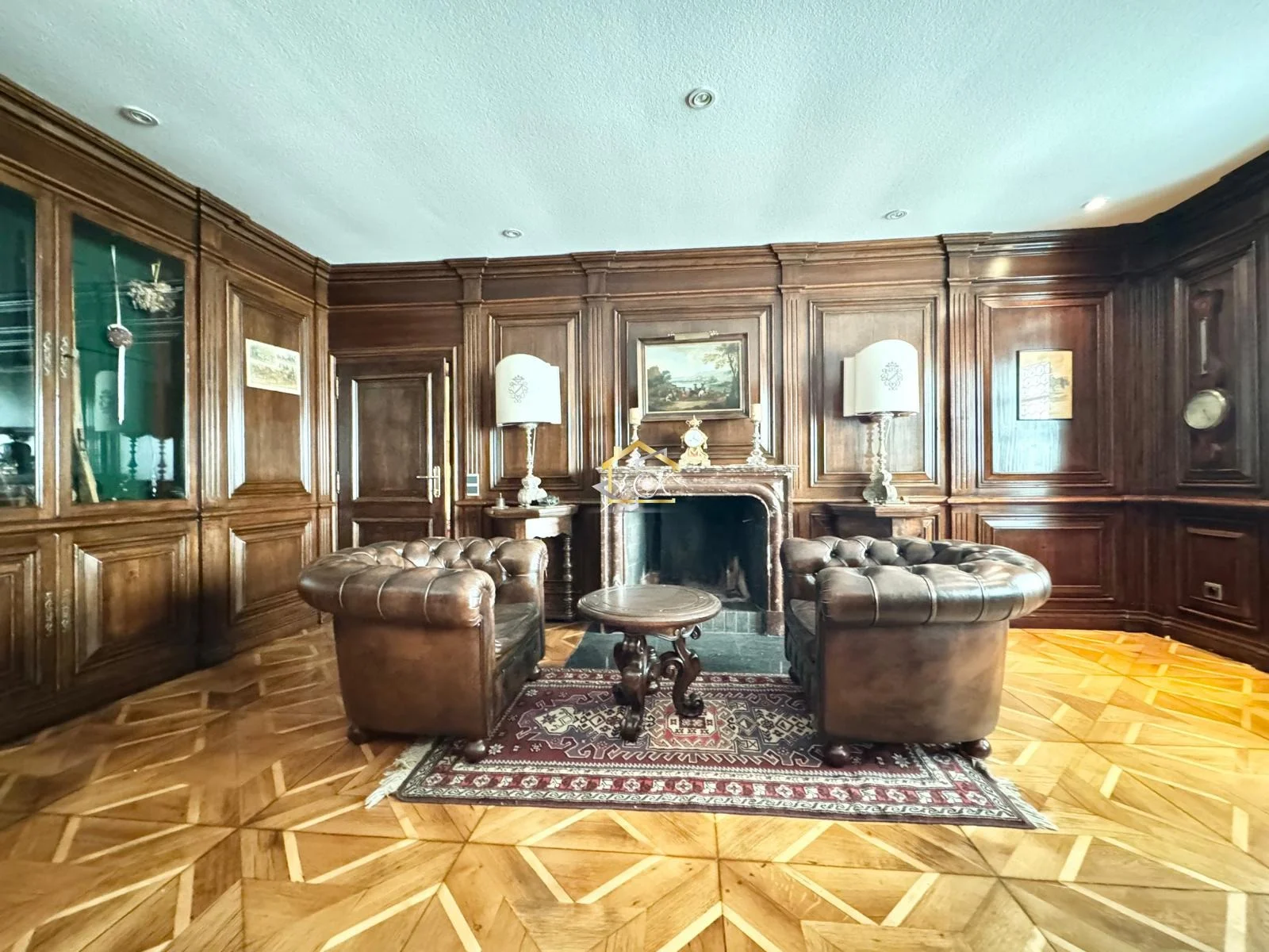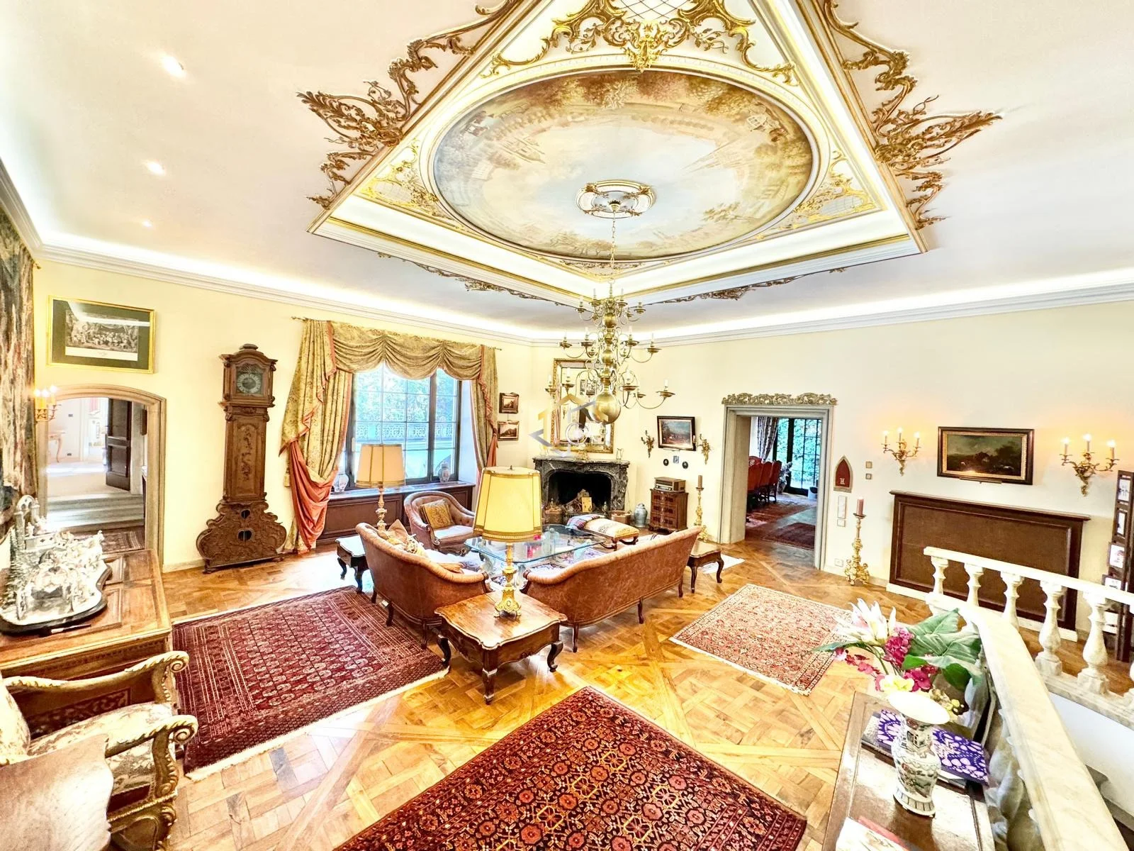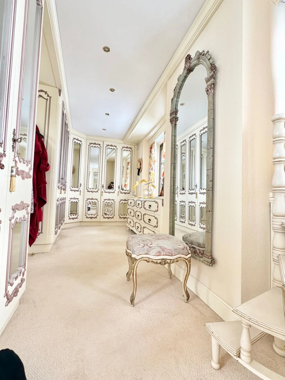 Das Obergeschoss bietet eine Küche und ein Esszimmer mit Zugang zu einer großen Terrasse, ein Kaminzimmer, ein Büro, fünf Schlafzimmer und fünf Bäder. Ein charmantes Studio-Apartment mit eigenem Eingang erweitert das Raumangebot.