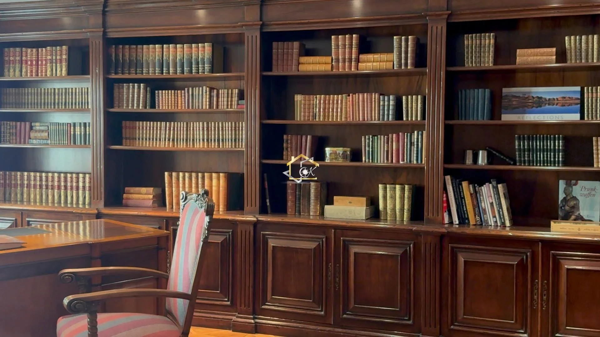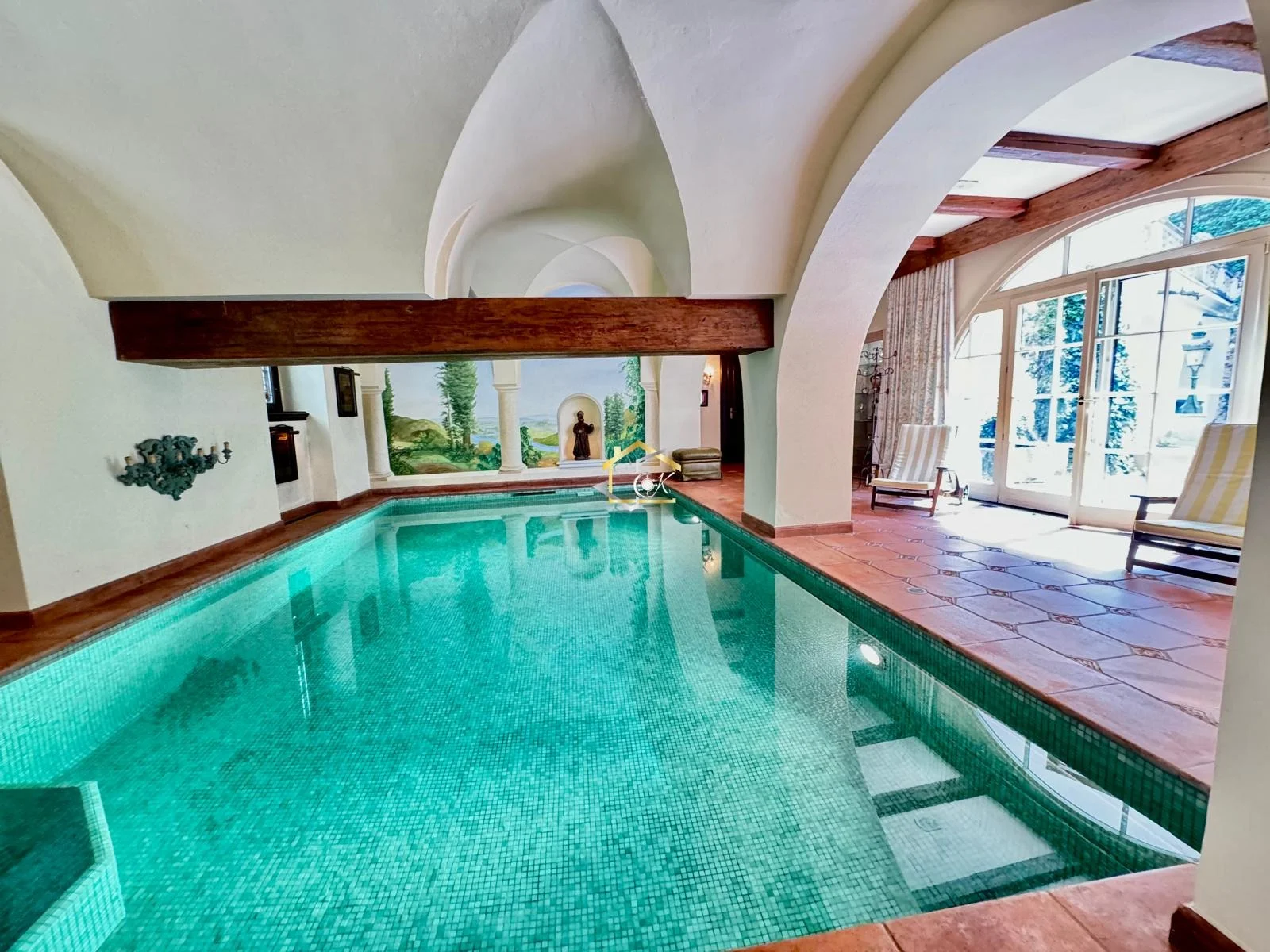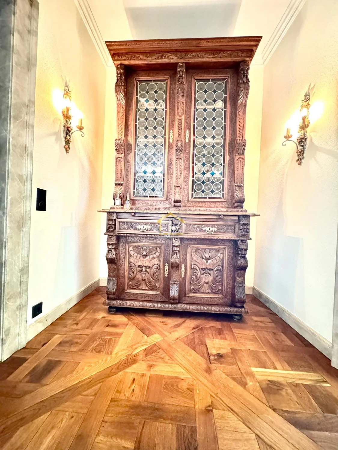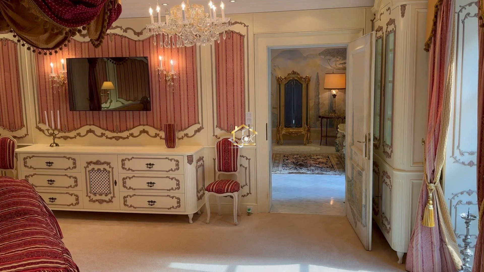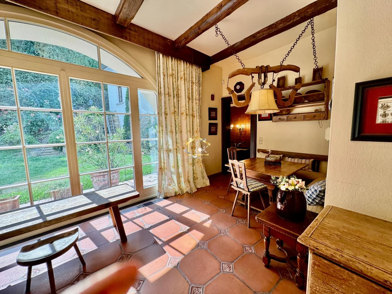 Das Obergeschoss bietet eine Küche und ein Esszimmer mit Zugang zu einer großen Terrasse, ein Kaminzimmer, ein Büro, fünf Schlafzimmer und fünf Bäder. Ein charmantes Studio-Apartment mit eigenem Eingang erweitert das Raumangebot.