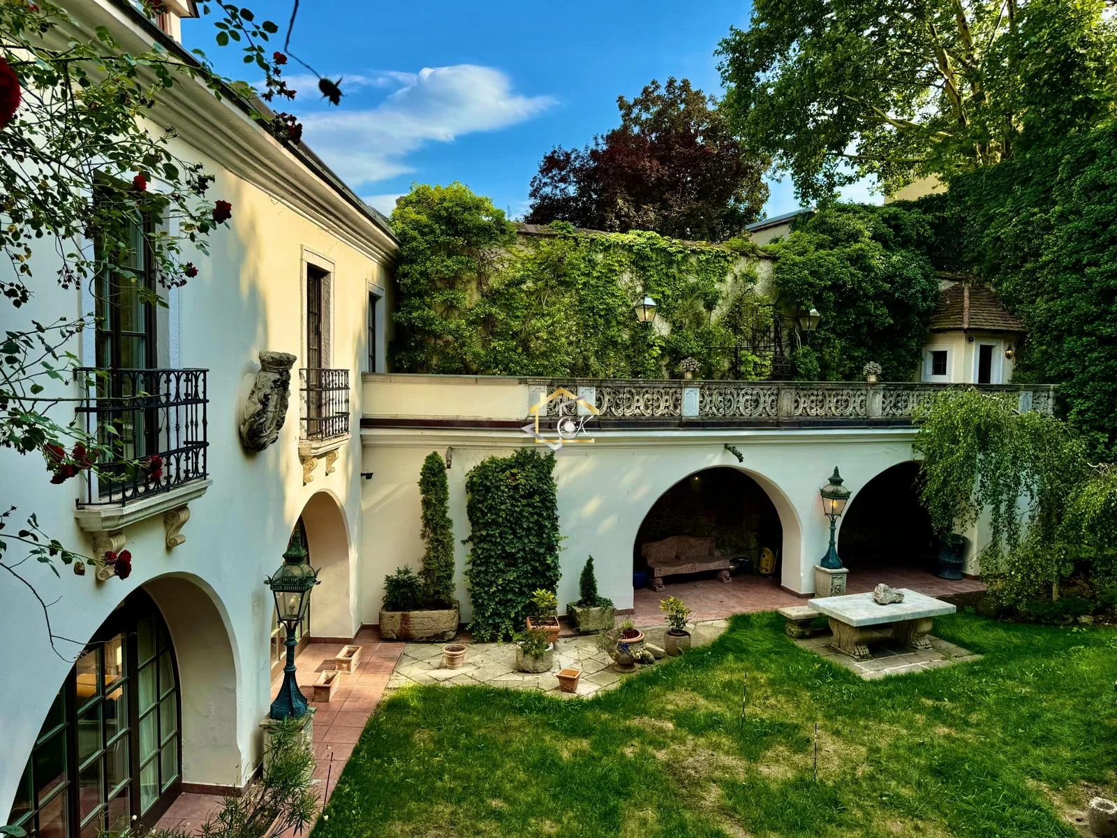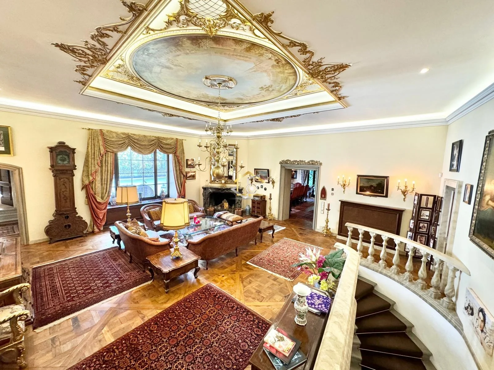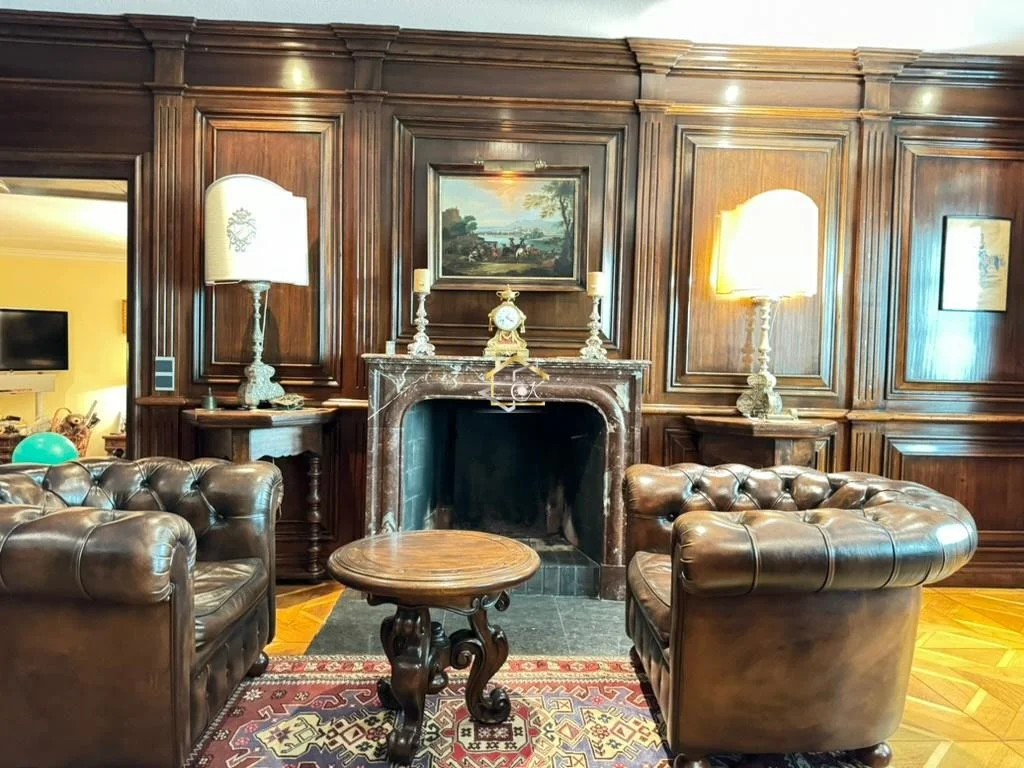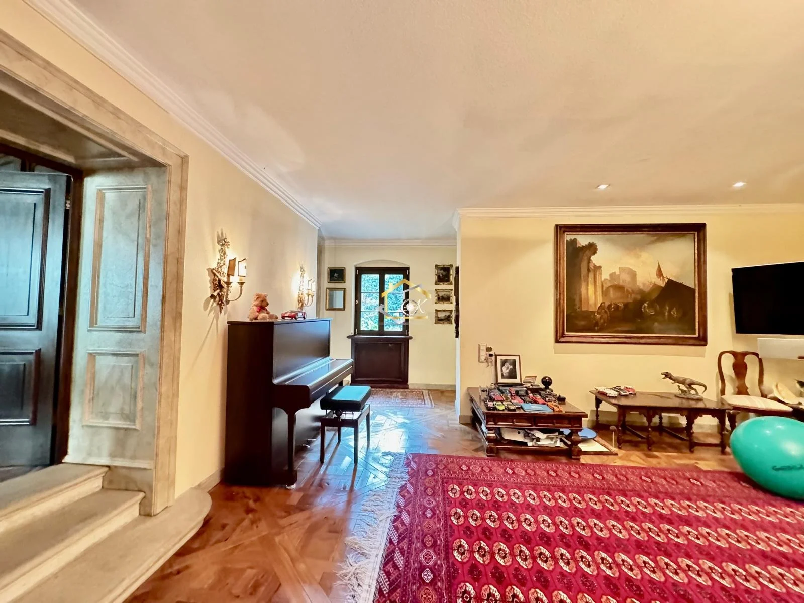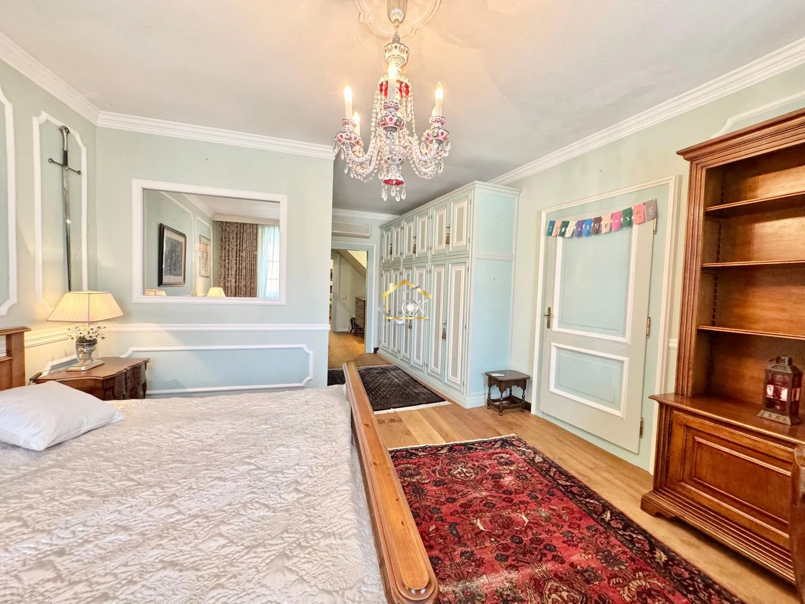 Das Obergeschoss bietet eine Küche und ein Esszimmer mit Zugang zu einer großen Terrasse, ein Kaminzimmer, ein Büro, fünf Schlafzimmer und fünf Bäder. Ein charmantes Studio-Apartment mit eigenem Eingang erweitert das Raumangebot.