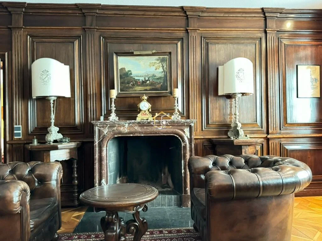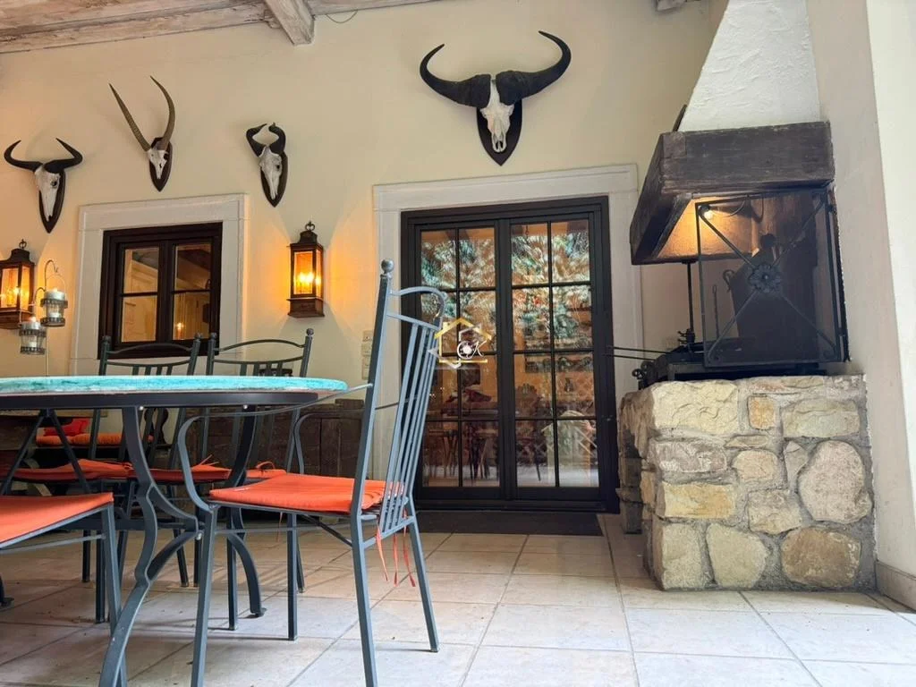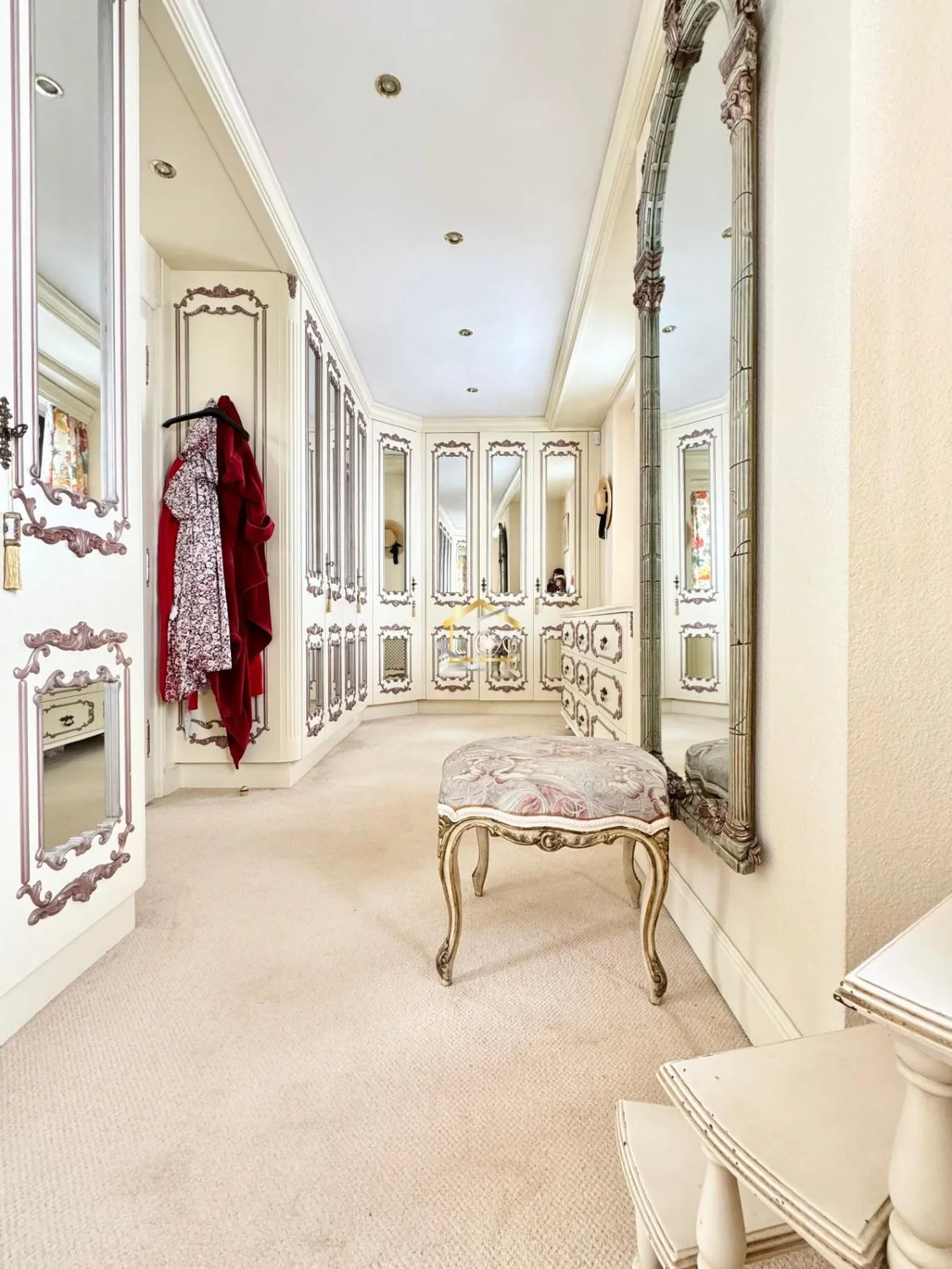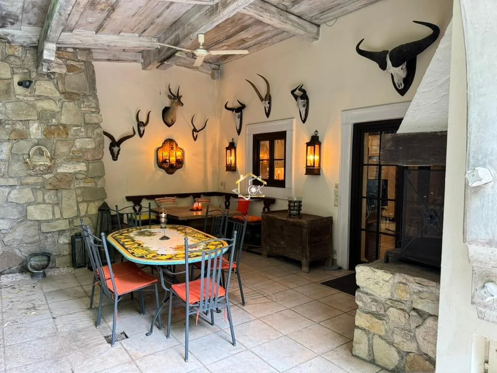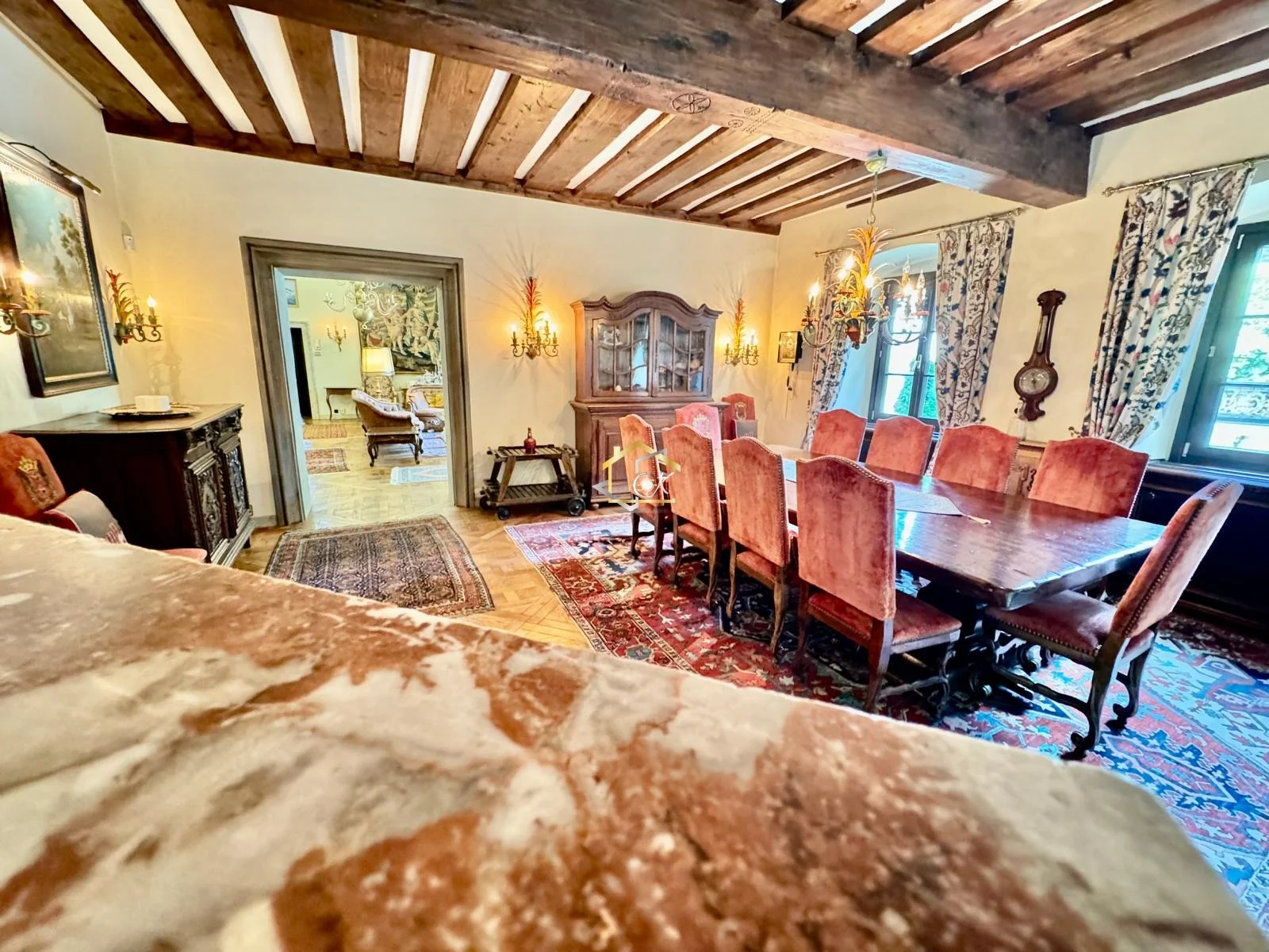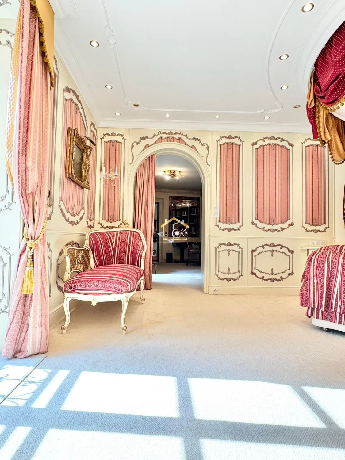 Das Obergeschoss bietet eine Küche und ein Esszimmer mit Zugang zu einer großen Terrasse, ein Kaminzimmer, ein Büro, fünf Schlafzimmer und fünf Bäder. Ein charmantes Studio-Apartment mit eigenem Eingang erweitert das Raumangebot.