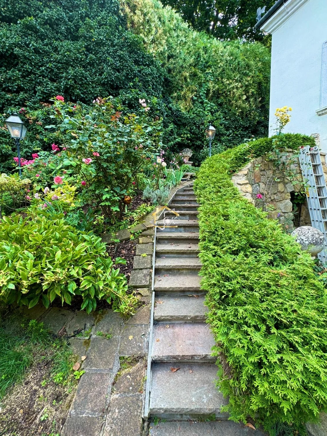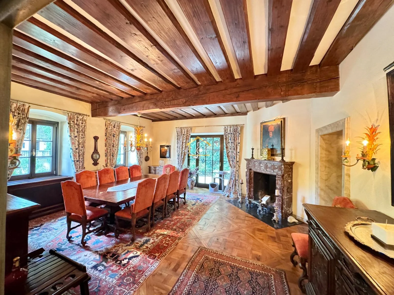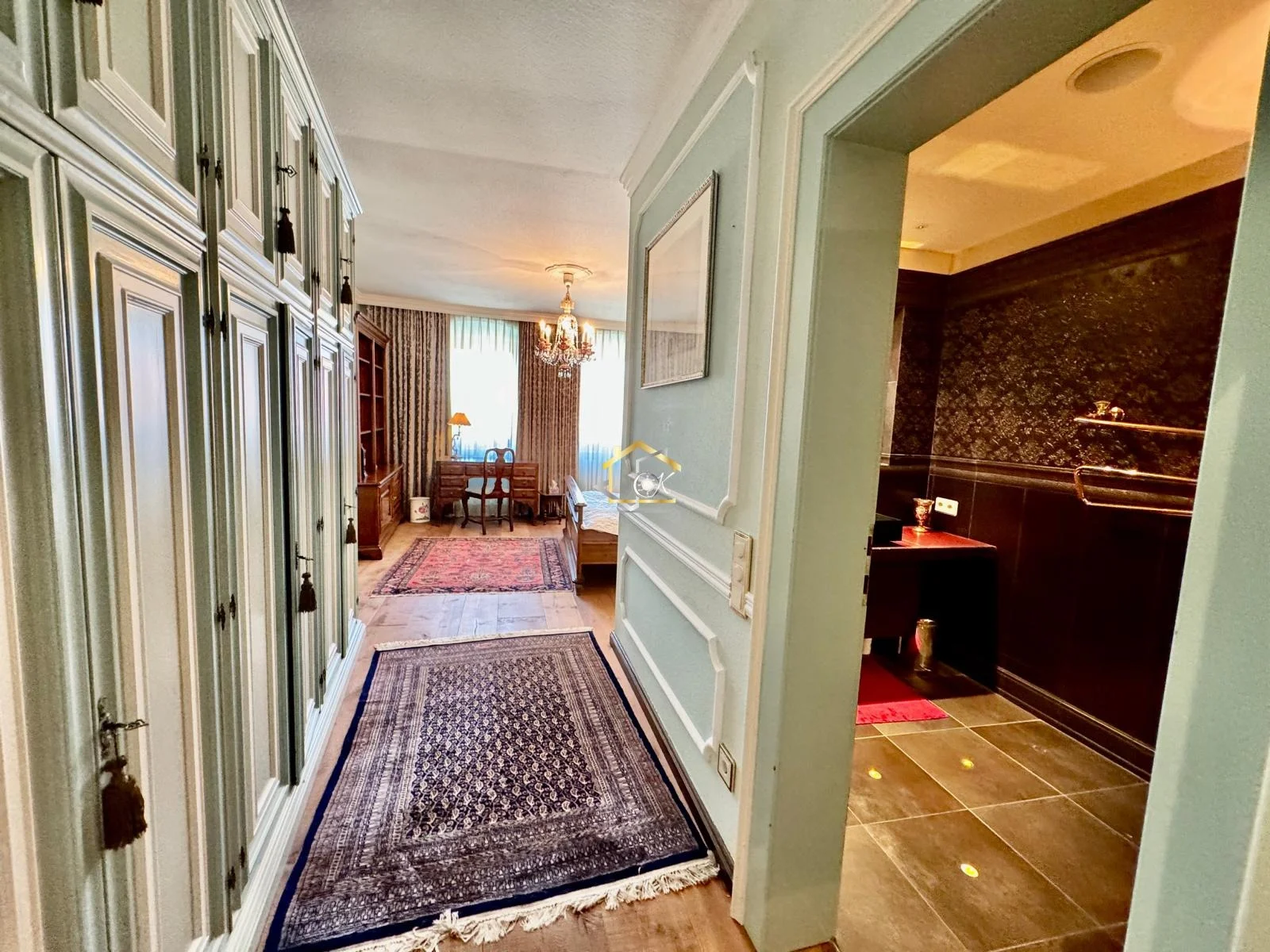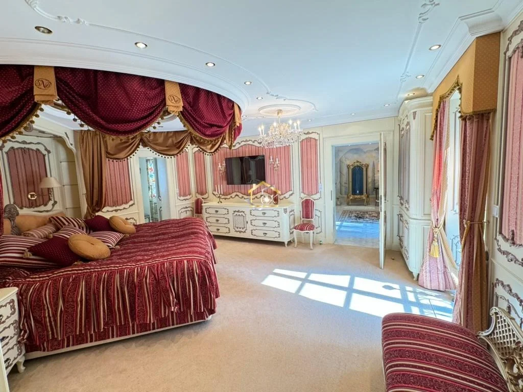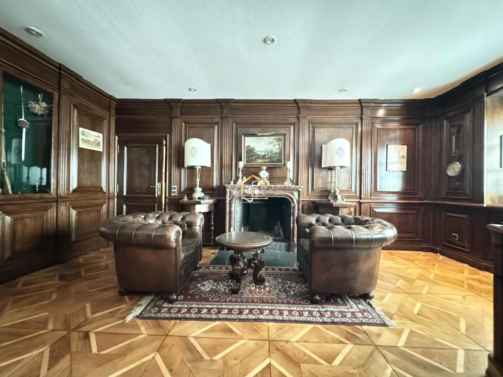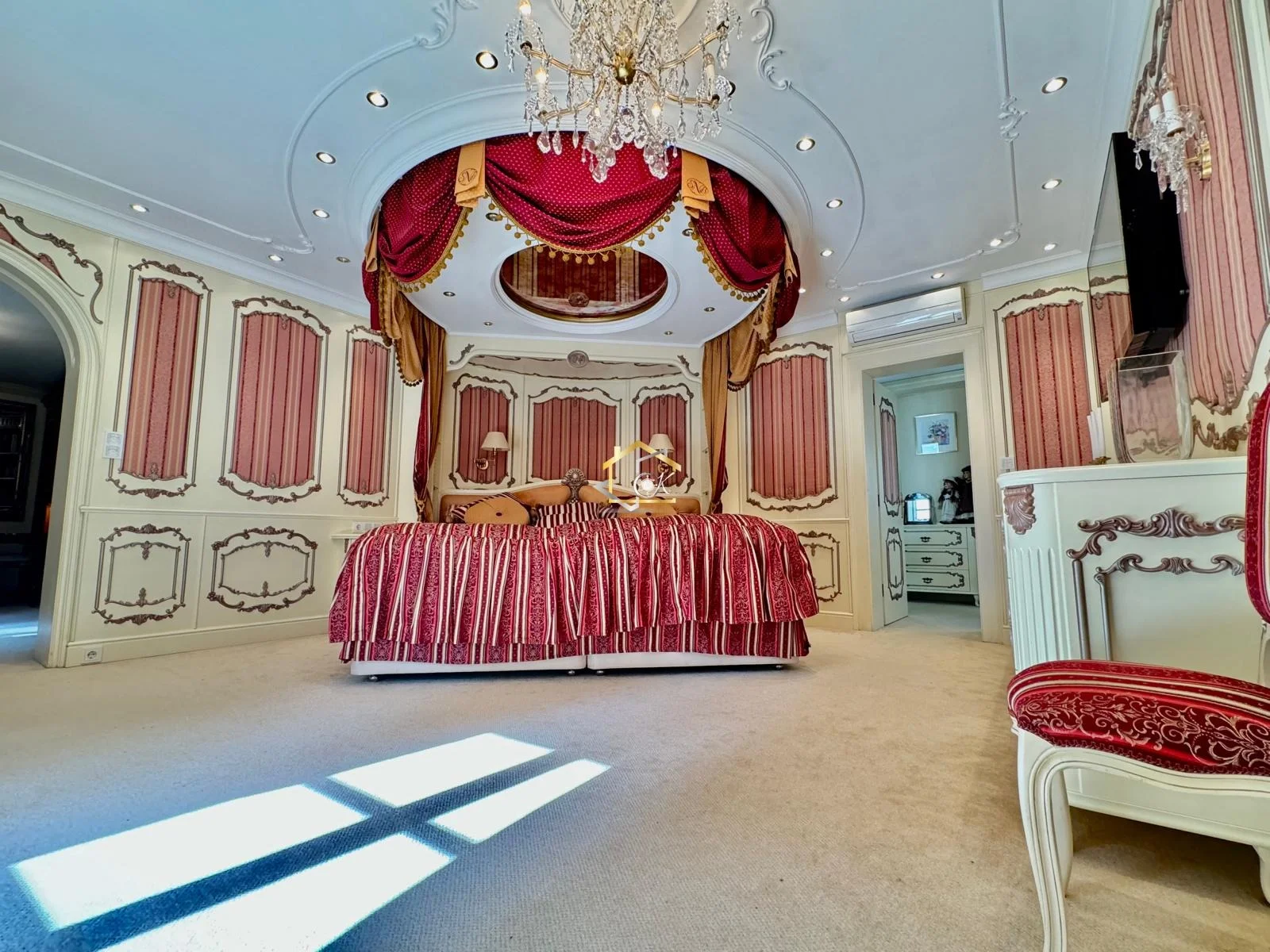 Das Obergeschoss bietet eine Küche und ein Esszimmer mit Zugang zu einer großen Terrasse, ein Kaminzimmer, ein Büro, fünf Schlafzimmer und fünf Bäder. Ein charmantes Studio-Apartment mit eigenem Eingang erweitert das Raumangebot.