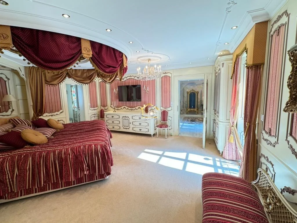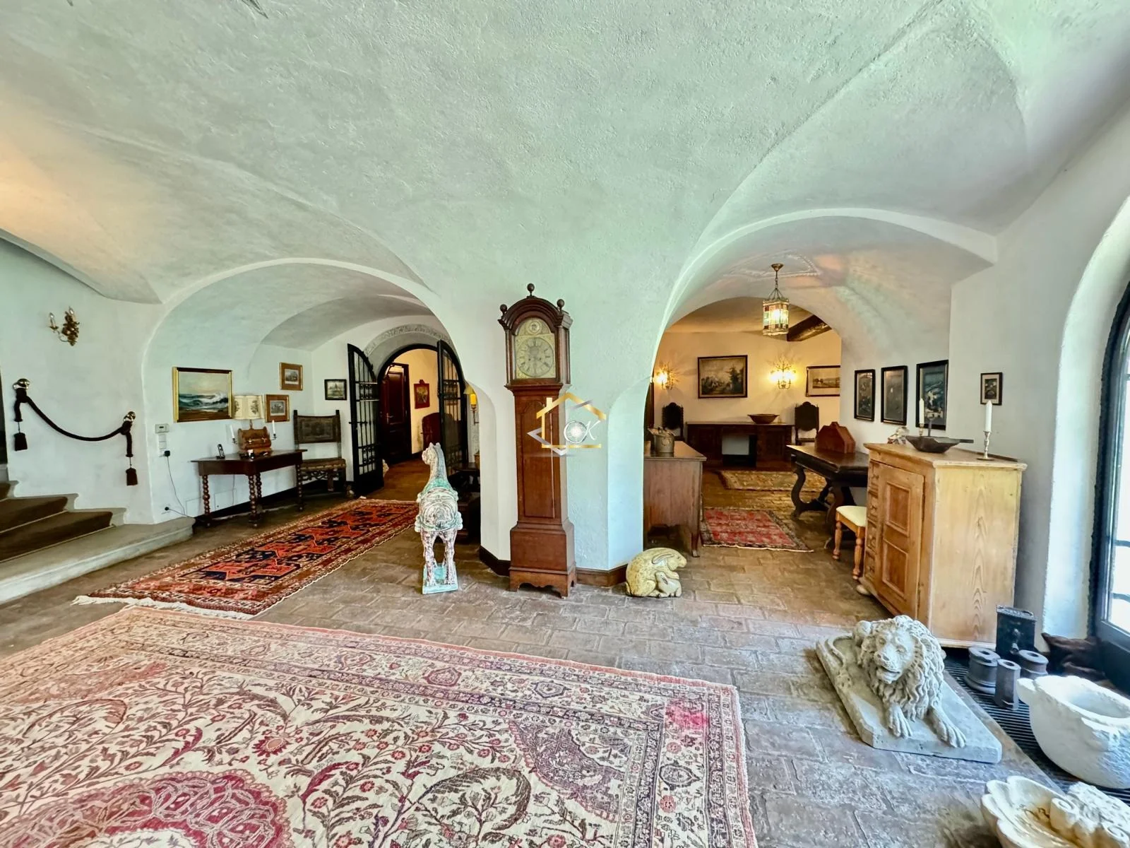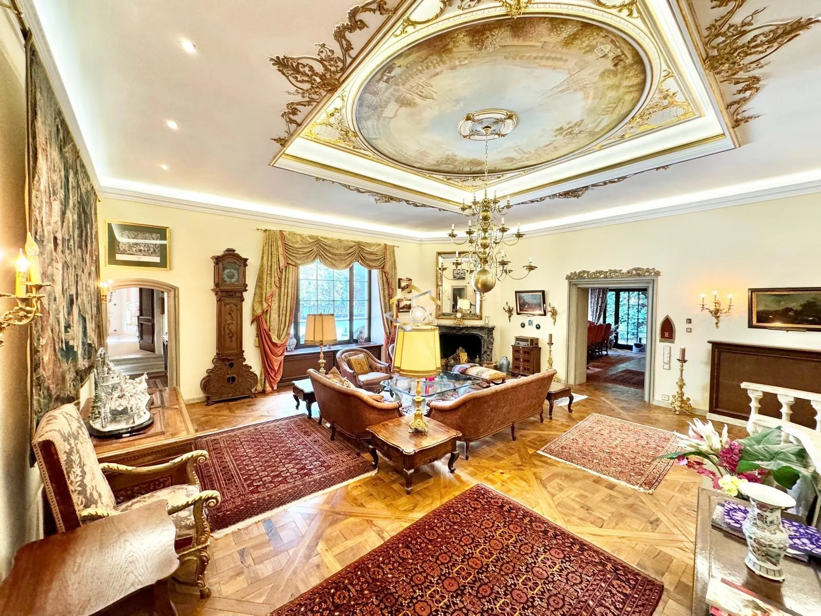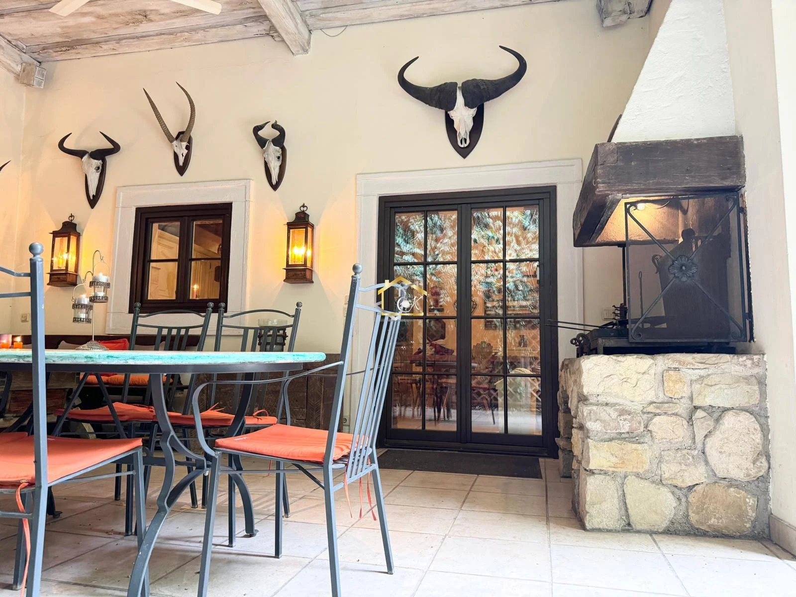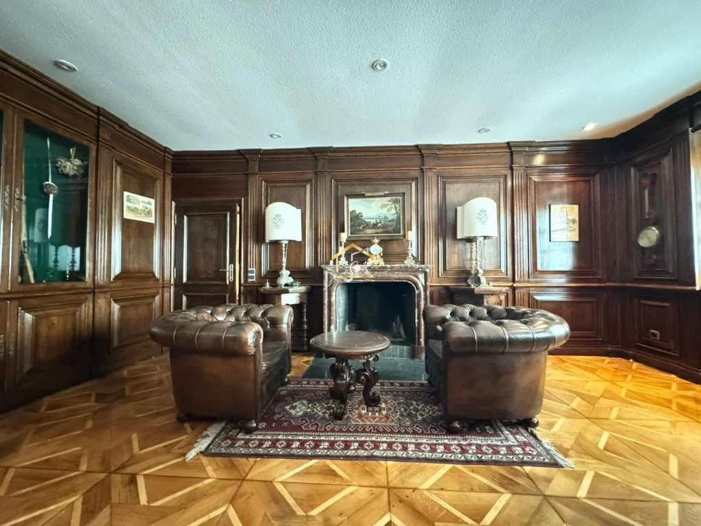 Das Obergeschoss bietet eine Küche und ein Esszimmer mit Zugang zu einer großen Terrasse, ein Kaminzimmer, ein Büro, fünf Schlafzimmer und fünf Bäder. Ein charmantes Studio-Apartment mit eigenem Eingang erweitert das Raumangebot.