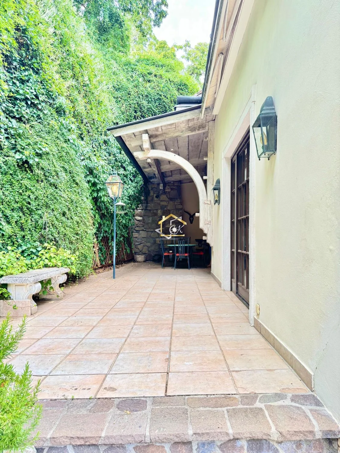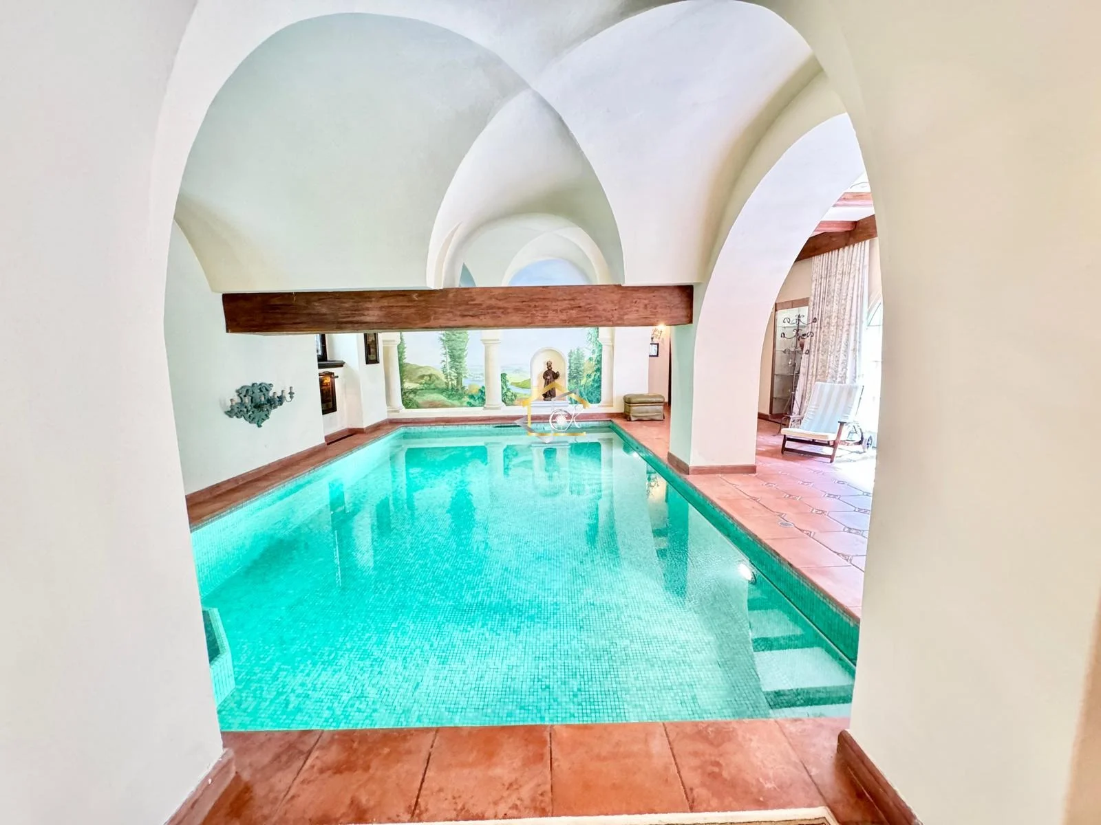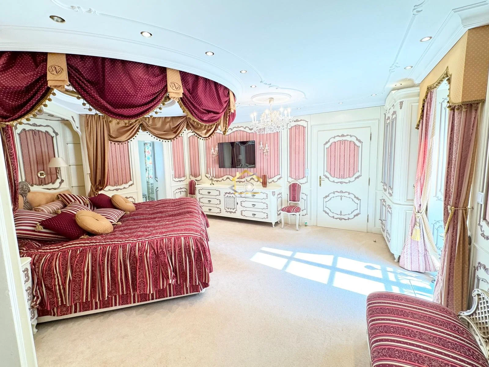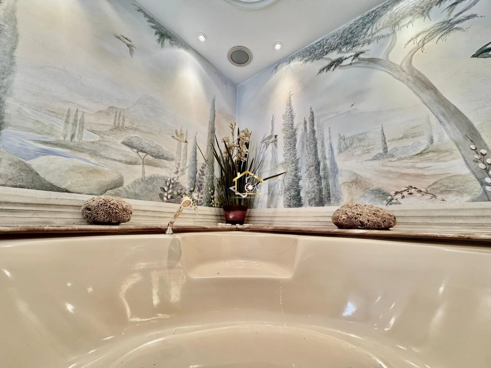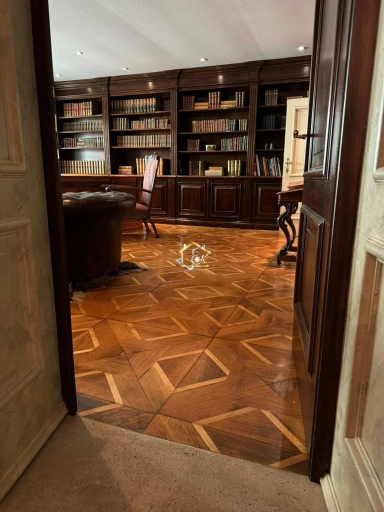 Das Obergeschoss bietet eine Küche und ein Esszimmer mit Zugang zu einer großen Terrasse, ein Kaminzimmer, ein Büro, fünf Schlafzimmer und fünf Bäder. Ein charmantes Studio-Apartment mit eigenem Eingang erweitert das Raumangebot.